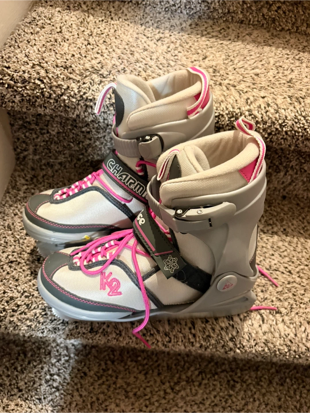 12ice skates in great condition! These are size US 1-5, perfect for growing feet. They feature a stylish grey and pink design and offer excellent support and comfort on the ice. Get ready to glide!
