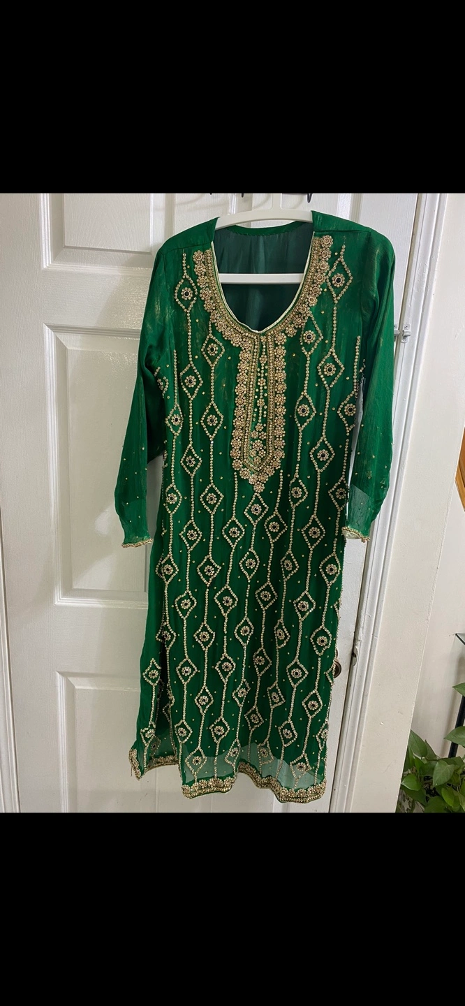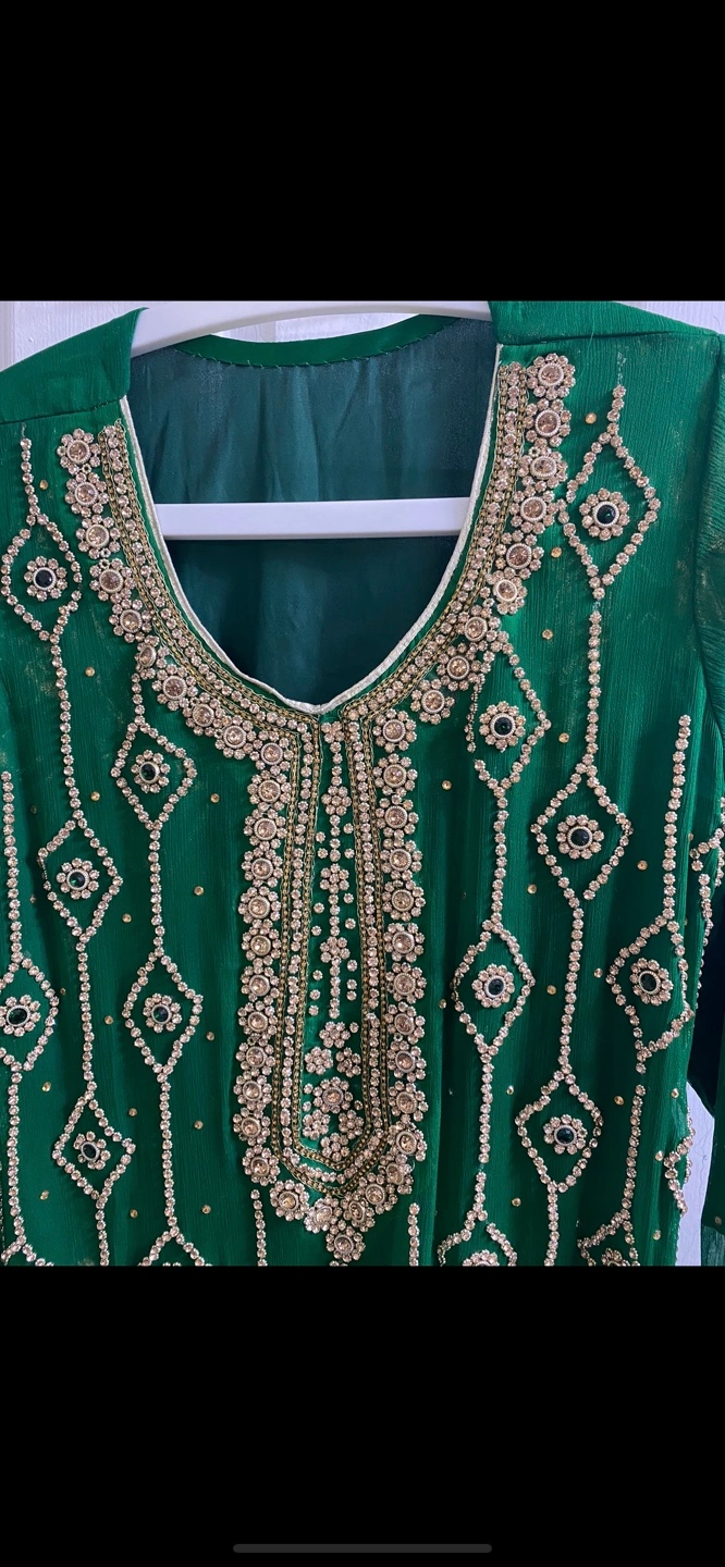 Beautiful emerald green three-piece shalwar kameez. Intricate gold and stone embellishments. Long sleeves. Matching dupatta included. Perfect for special occasions.