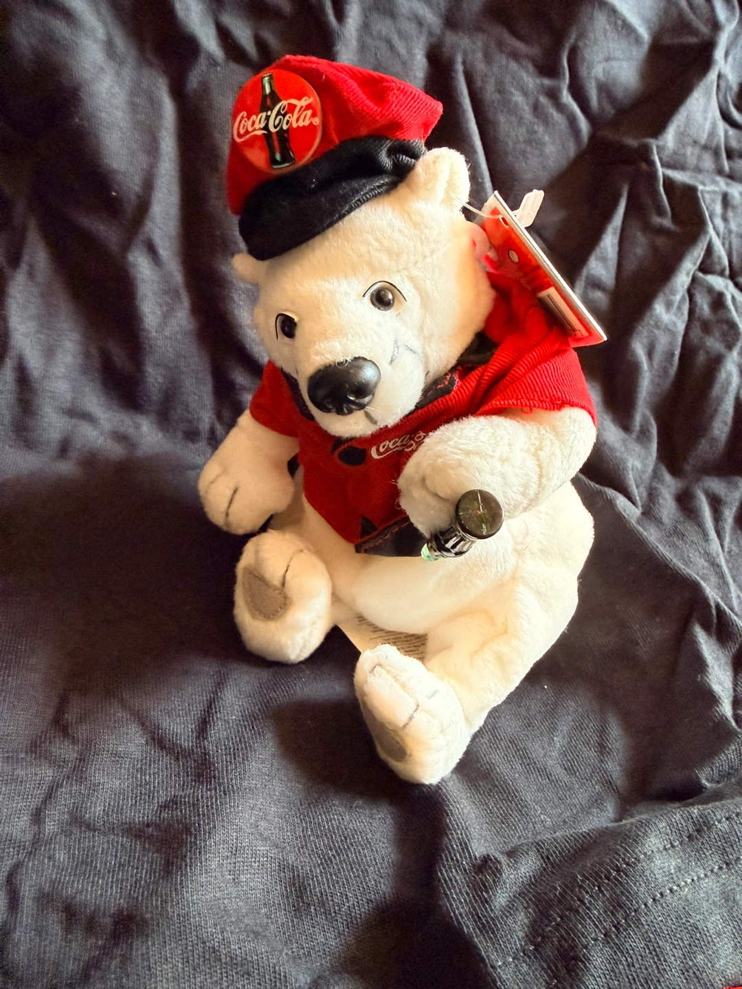 Cute Coca-Cola polar bear plush toy dressed in a red shirt and hat. It's a soft, cuddly collectible. This item is great for any Coca-Cola enthusiast!