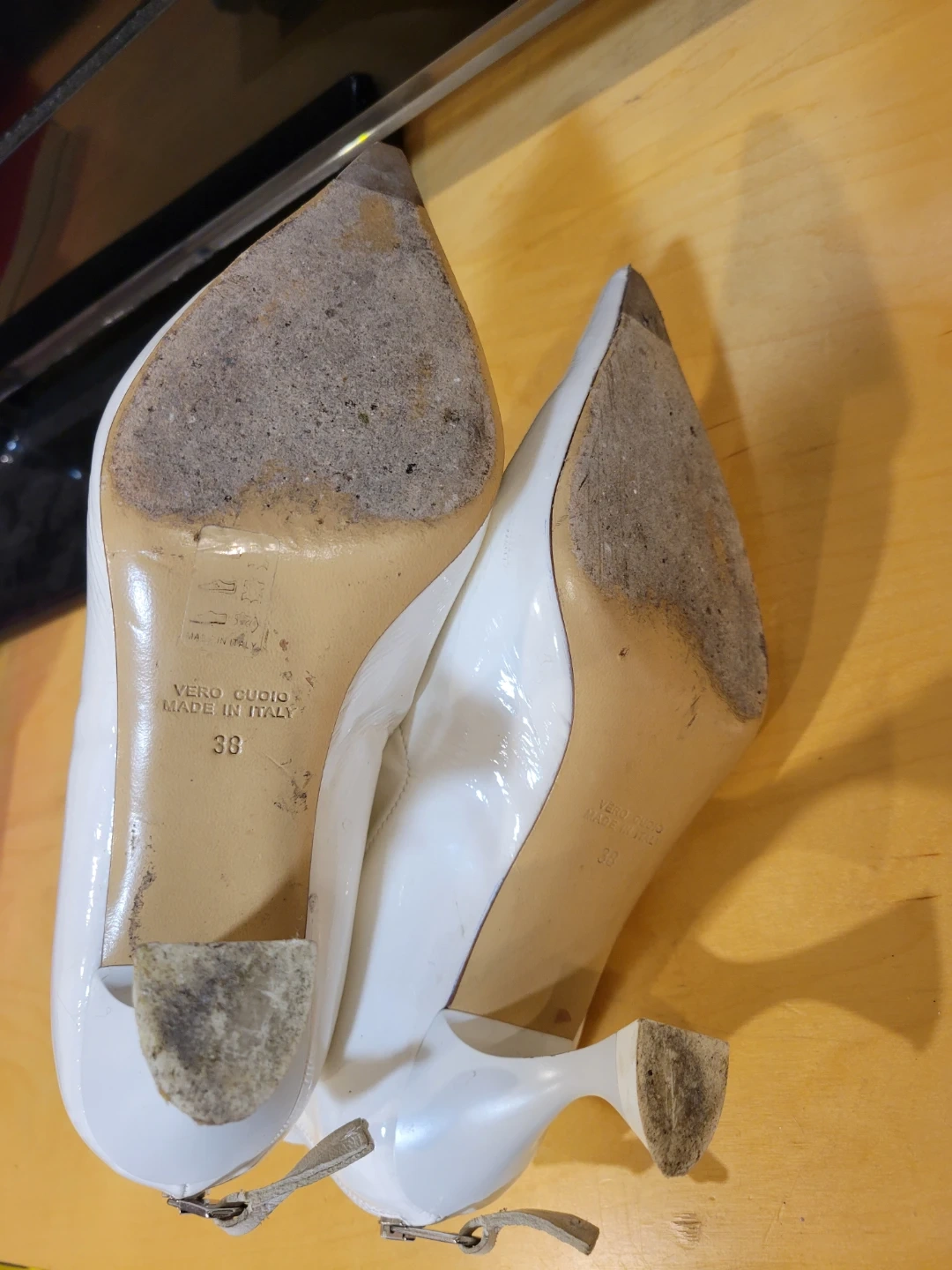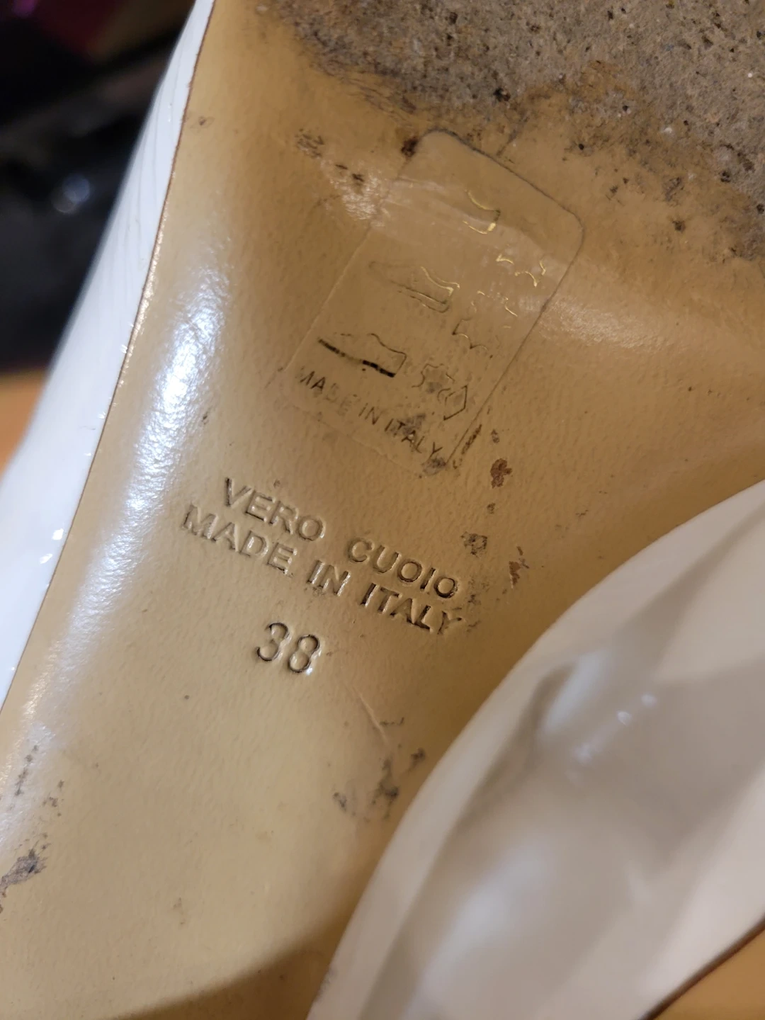 STRATEGIA white patent leather ankle boots with a pointed toe and a unique heel. Made in Italy. Size 38. Zippers up the back for closure. Pickup location eglinton and dufferin area or yonge and bloor