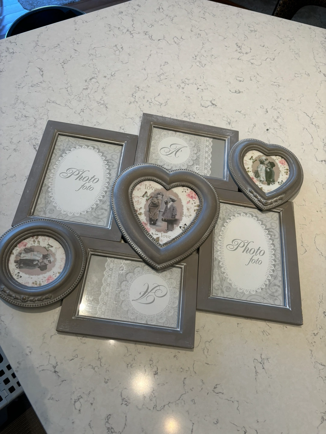 This is a set of six picture frames with a grey finish. The frames are in various shapes, including oval, rectangle, and heart. They are all decorated with lace look. Brand New, didn’t suit my decor.