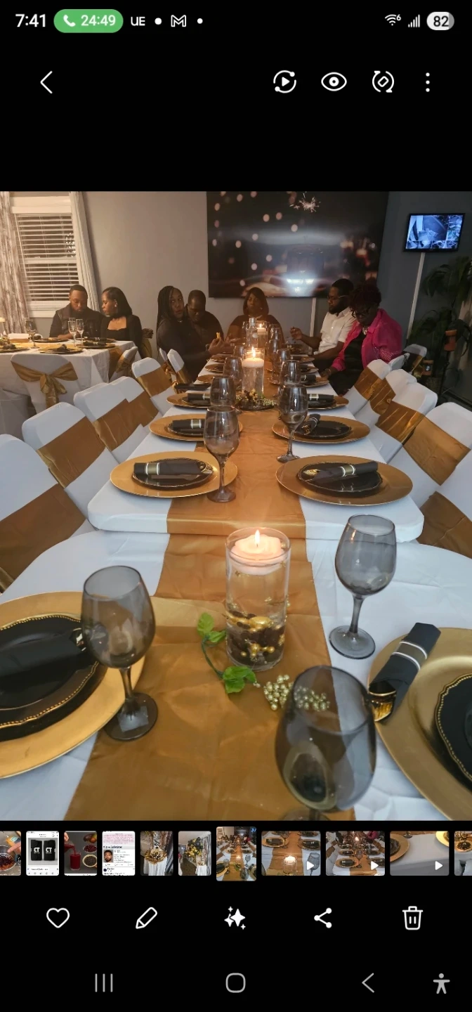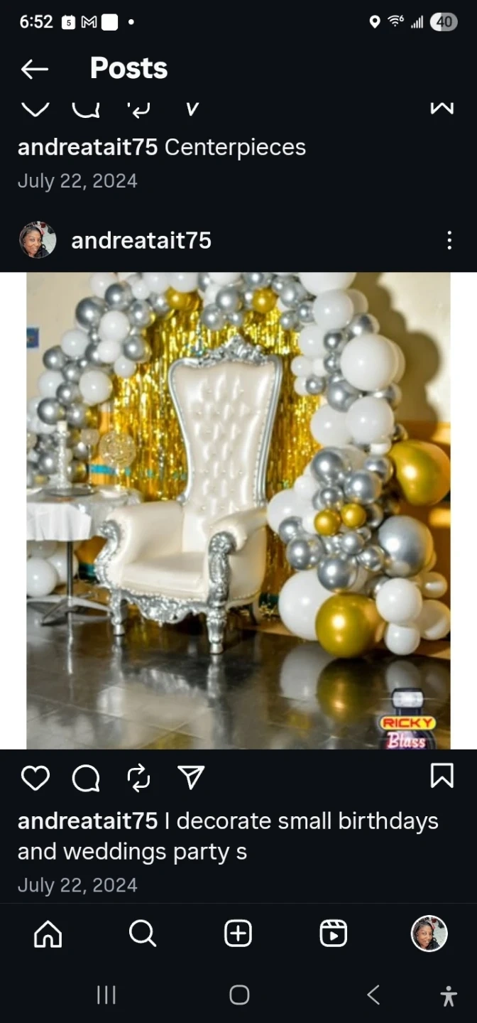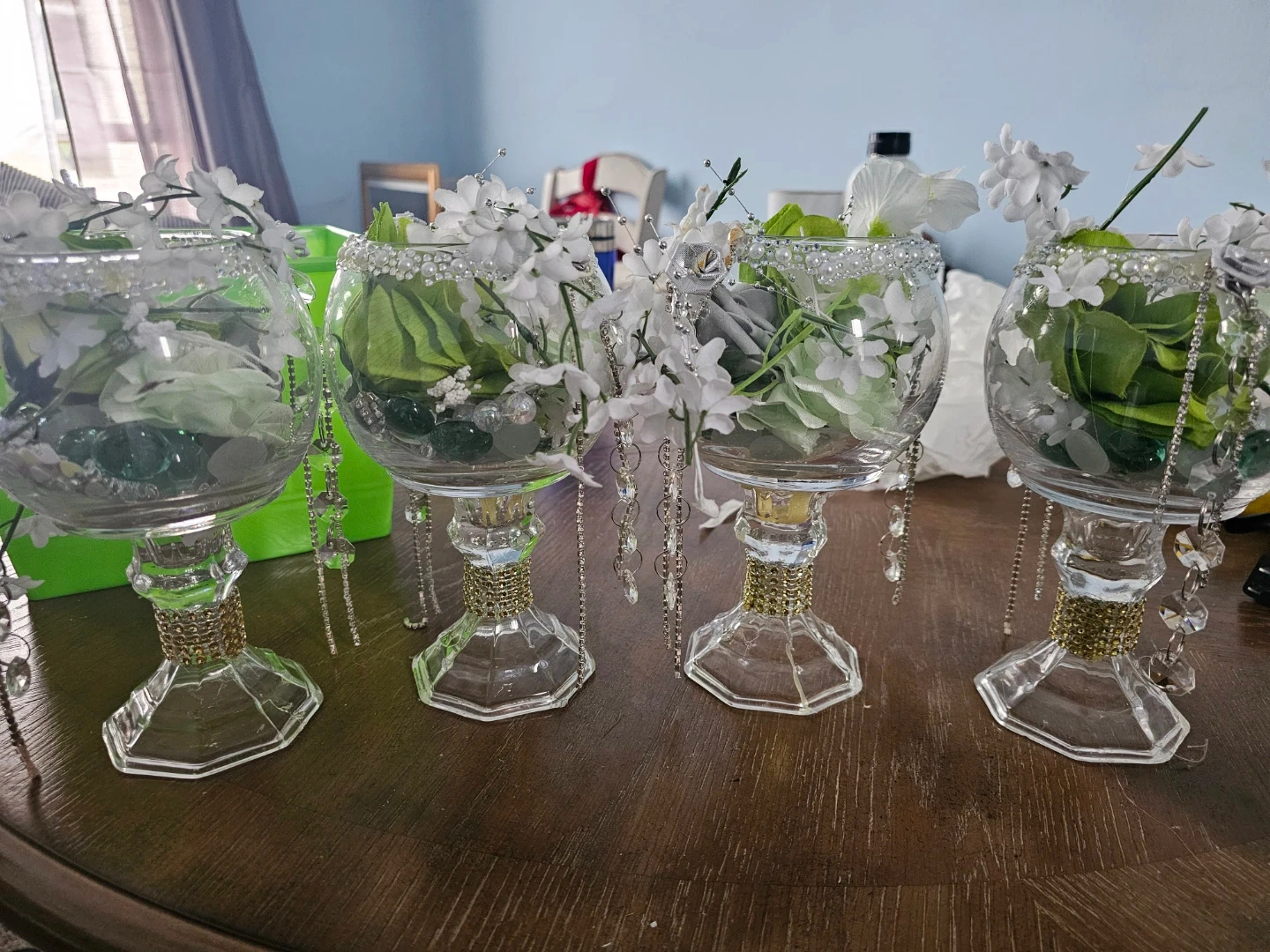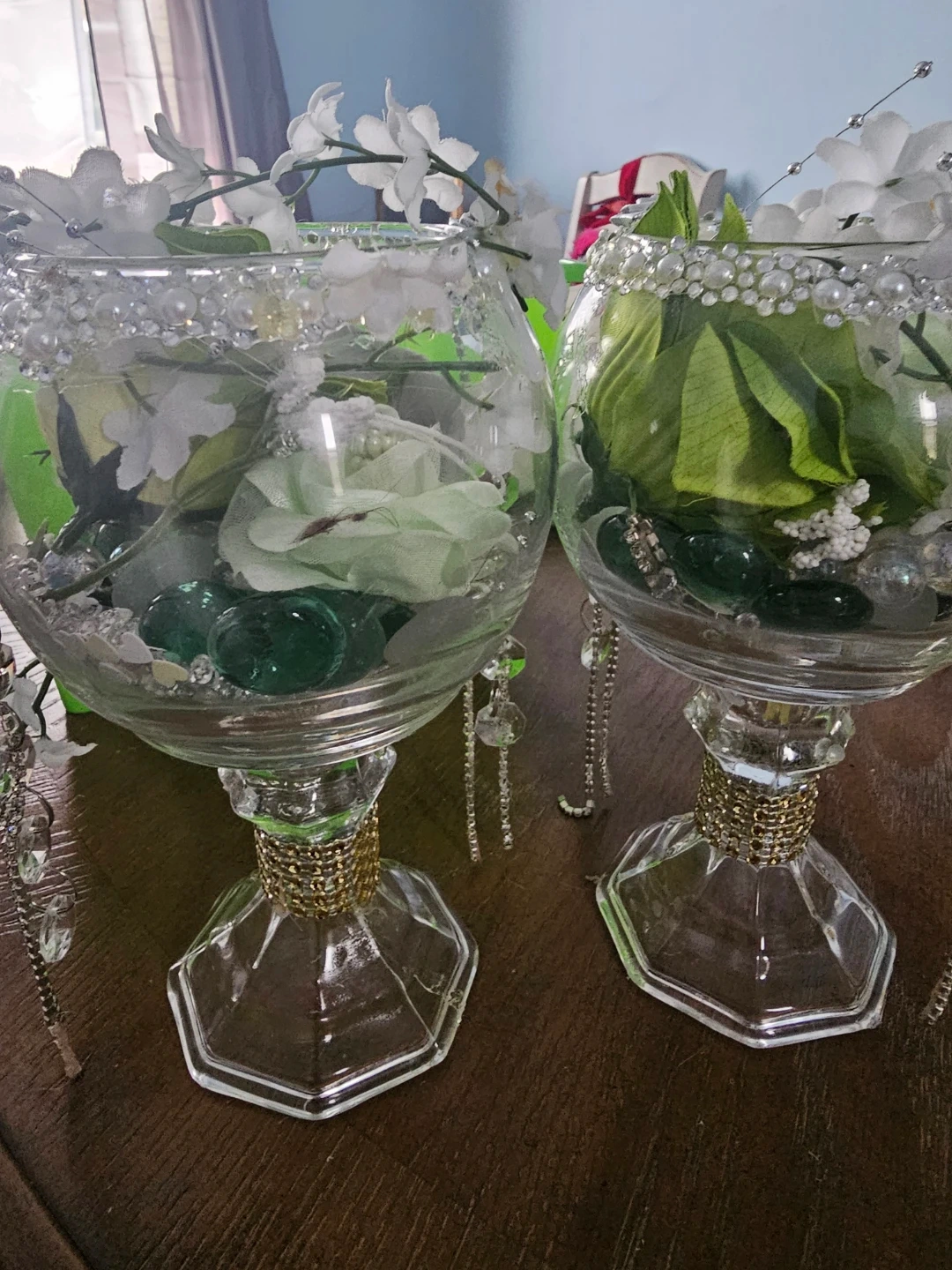 Two elegant glass centerpieces filled with faux white and green flowers and decorative accents. They feature beaded details and gold accents on the bases. Perfect for adding a touch of class to any event!