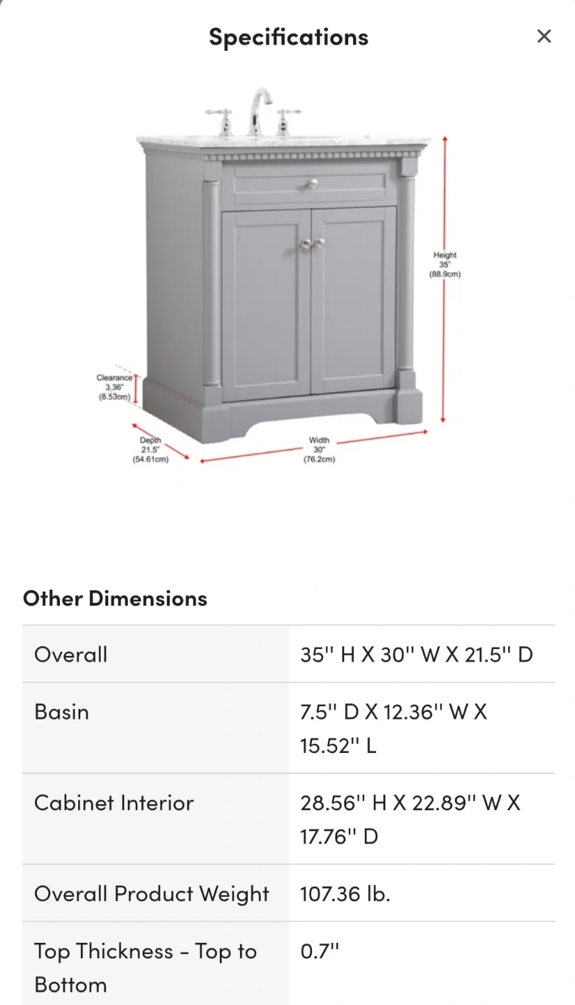 - Basin: 7.5" D x 12.36" W x 15.52" L