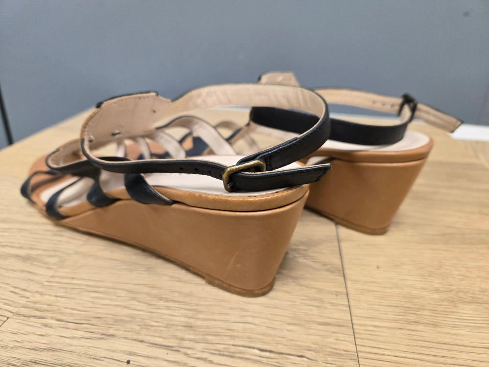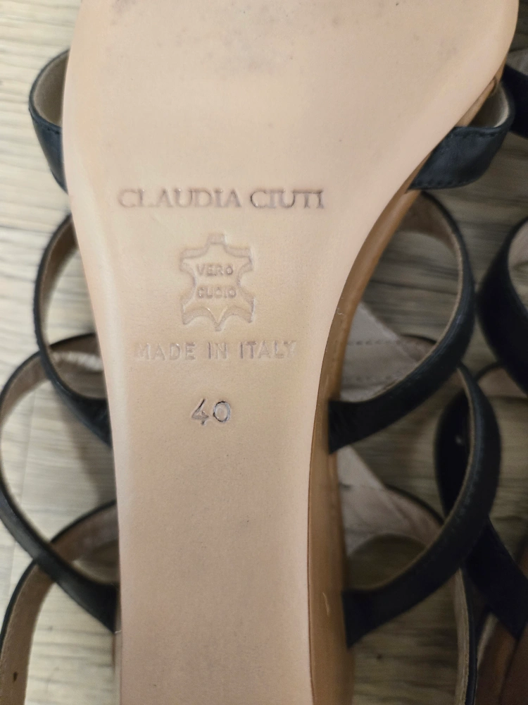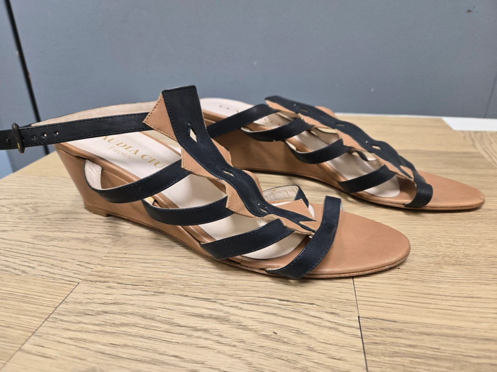 Selling a pair of Claudia Ciuti Firenze wedge sandals. They feature a unique black and tan design. The size is 40, made in Italy! They're in good condition and ready for a new home