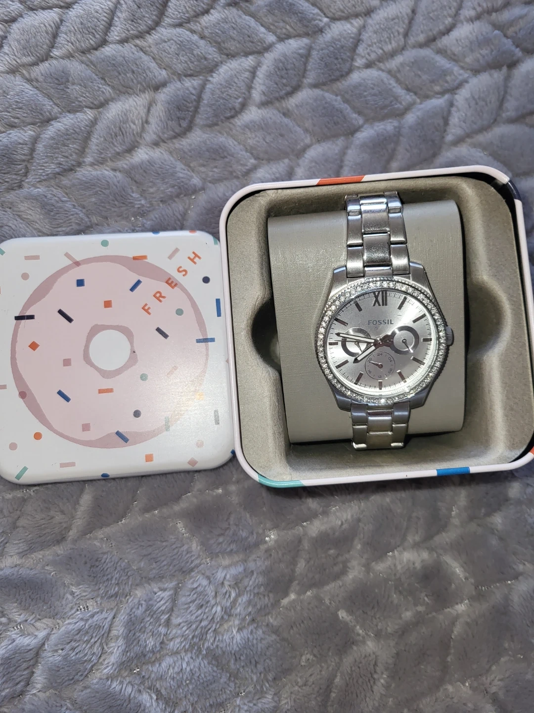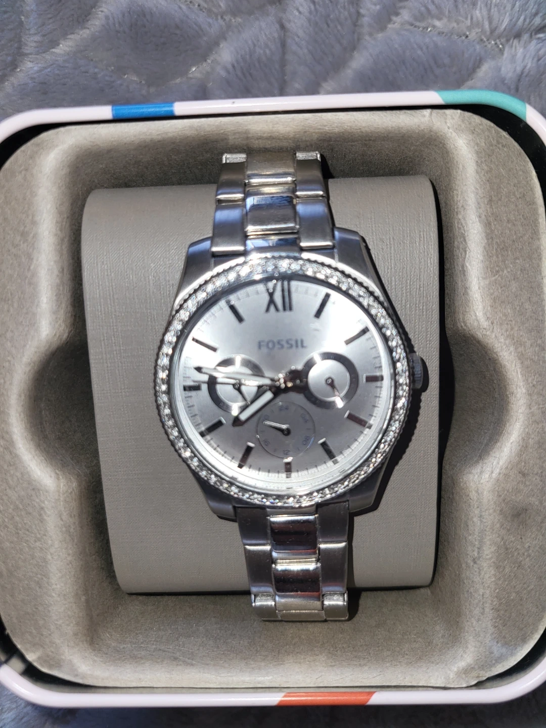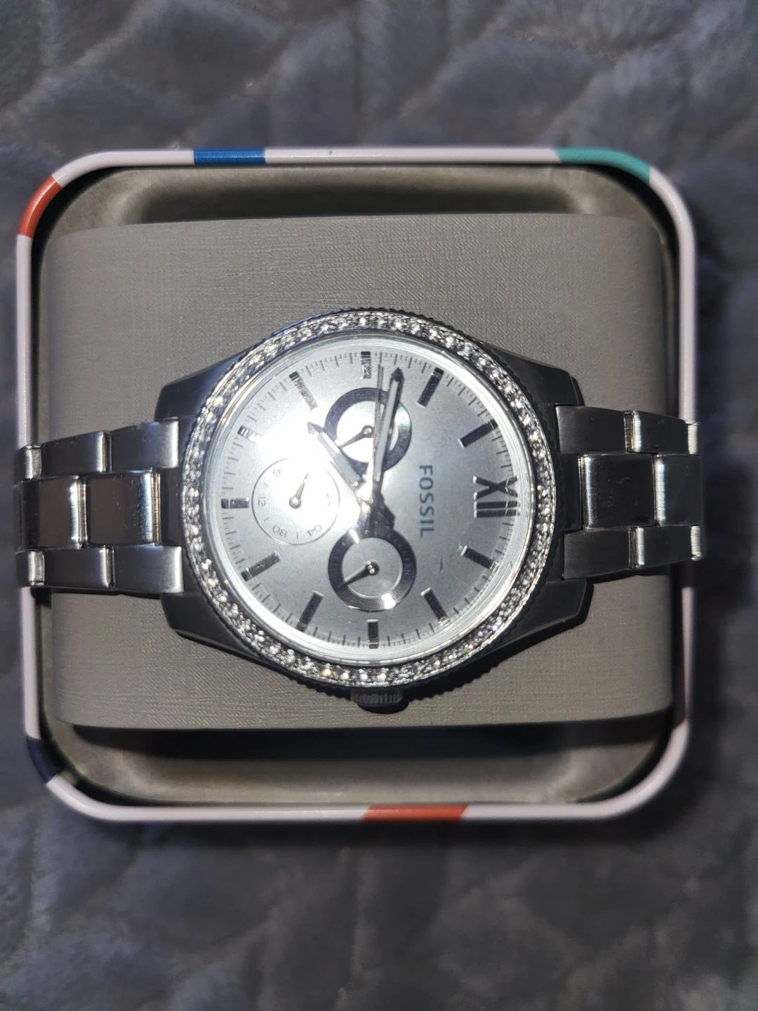 This Fossil watch features a silver-tone stainless steel band and a striking crystal-embellished bezel. It has a classic silver dial with Roman numerals and sub-dials. The watch comes in its original tin, which has a fun donut design.