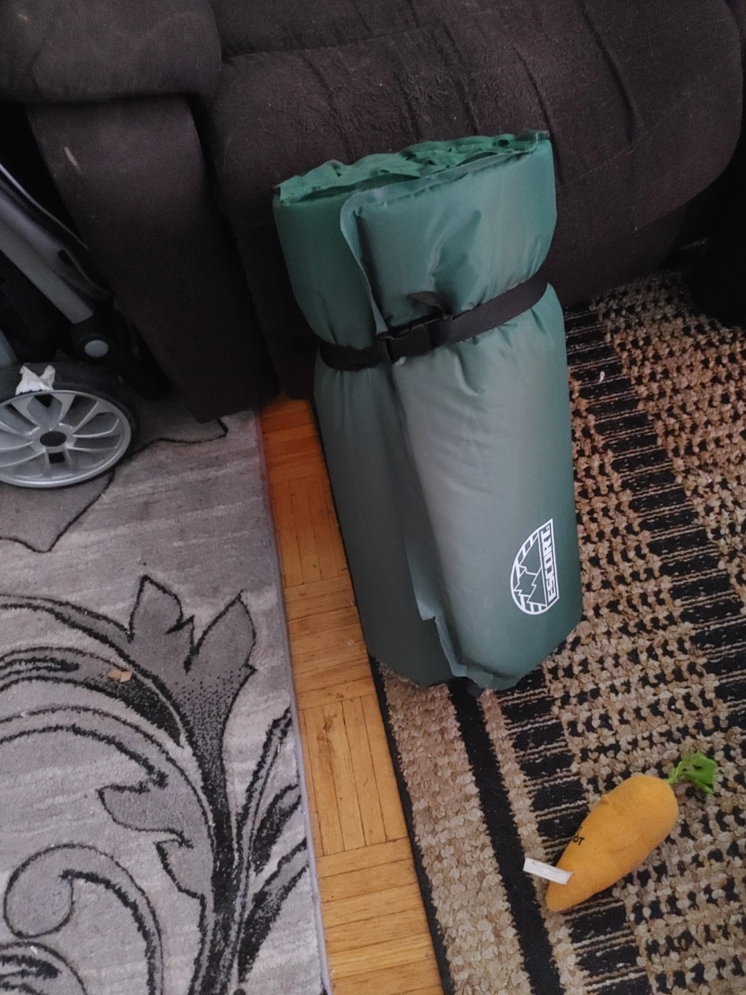 This green self-inflating sleeping pad is perfect for camping trips. It rolls up compactly for easy transport. Includes straps for securing when rolled.