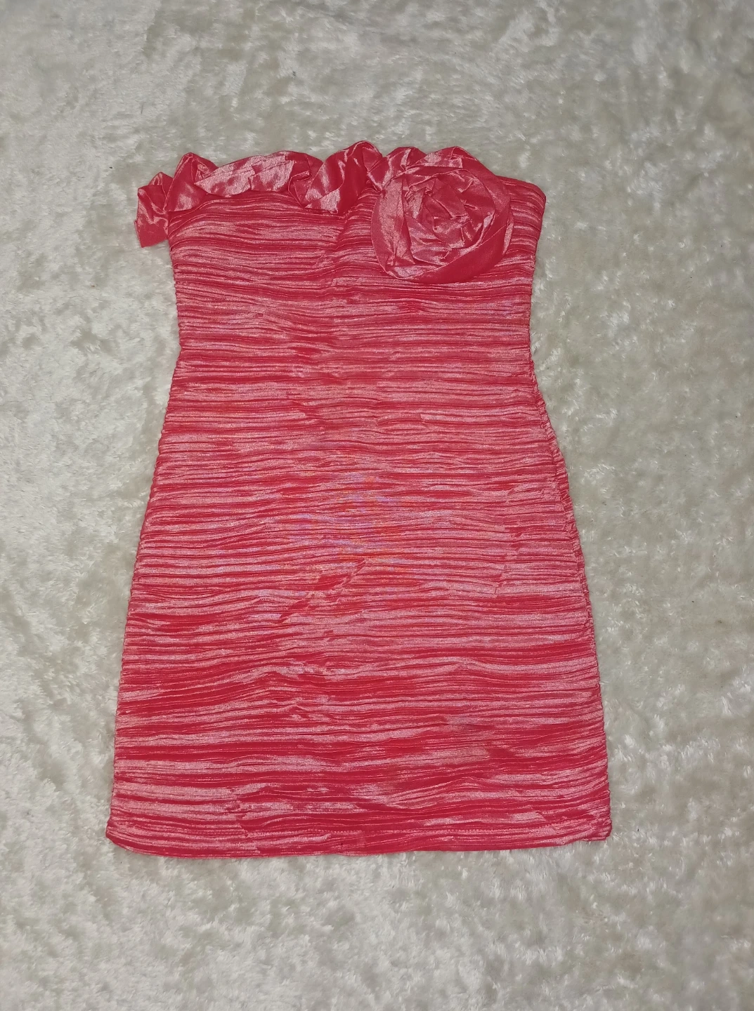 This is a cute strapless mini dress in a pink colour. It has a unique ruched design and a floral detail on the top. It's perfect for a night out or a special occasion!
