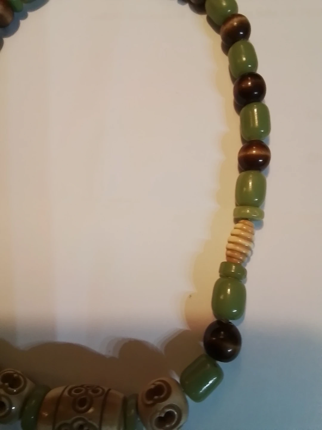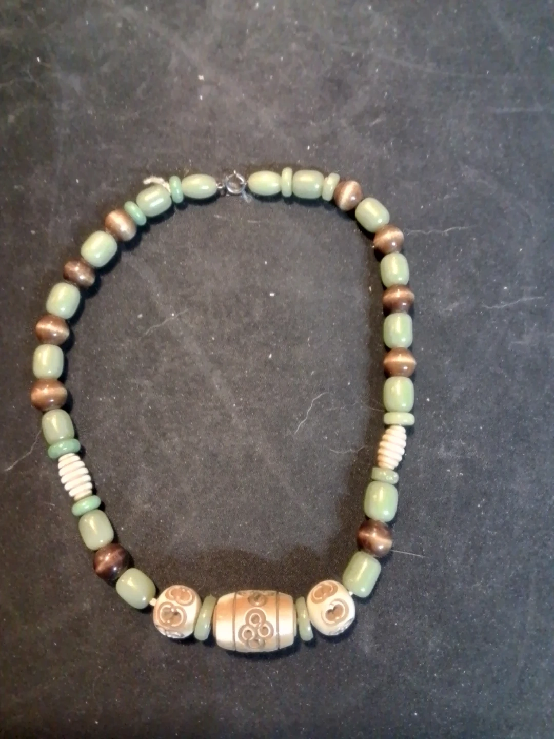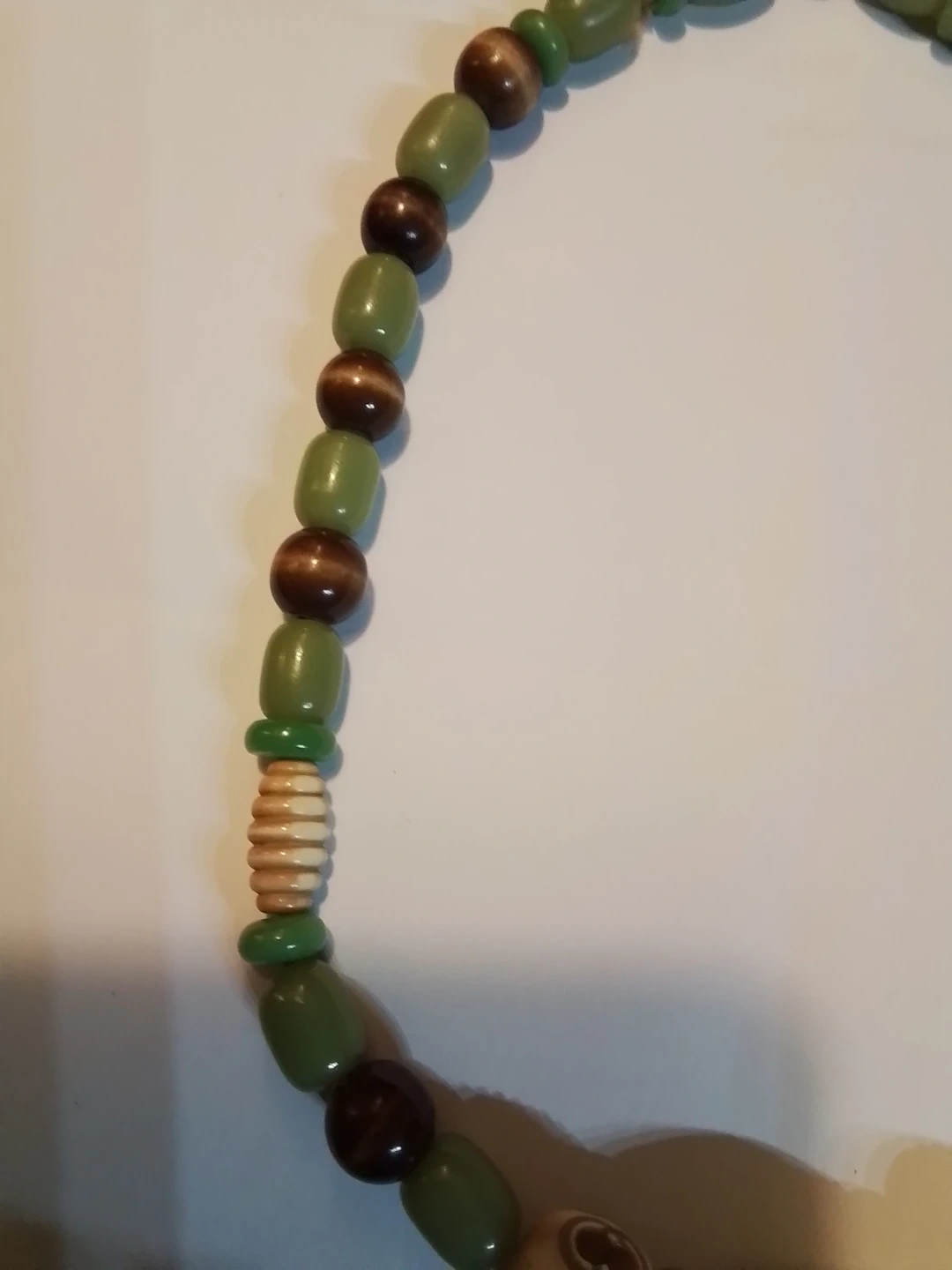 This exquisite vintage necklace features a beautiful combination of jade, bone, bakelite, and carved nut beads, creating a unique and eye-catching design, with a length of 16 inches. Being a vintage item, it has some wear that adds to its distinctive character. It's a piece that tells a story!