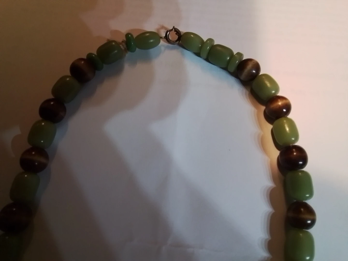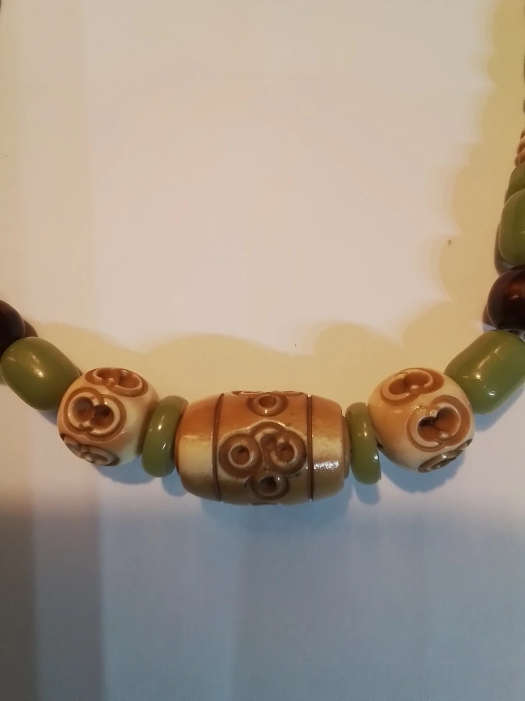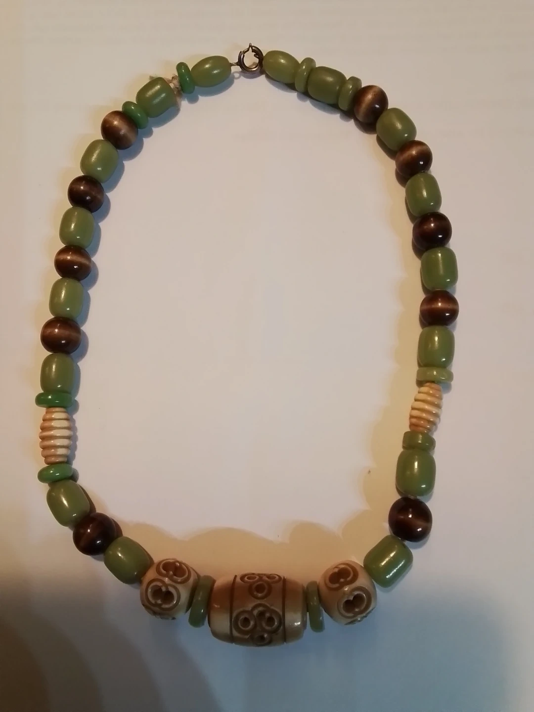 This exquisite vintage necklace features a beautiful combination of jade, bone, bakelite, and carved nut beads, creating a unique and eye-catching design, with a length of 16 inches. Being a vintage item, it has some wear that adds to its distinctive character. It's a piece that tells a story!