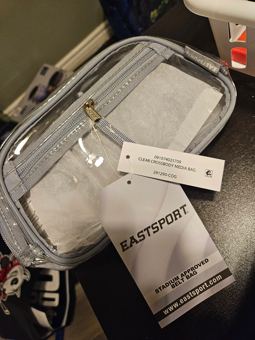 This Eastsport bag is stadium approved for convenience. It's a clear crossbody media bag with a grey trim. It's perfect for carrying your essentials while adhering to venue policies.