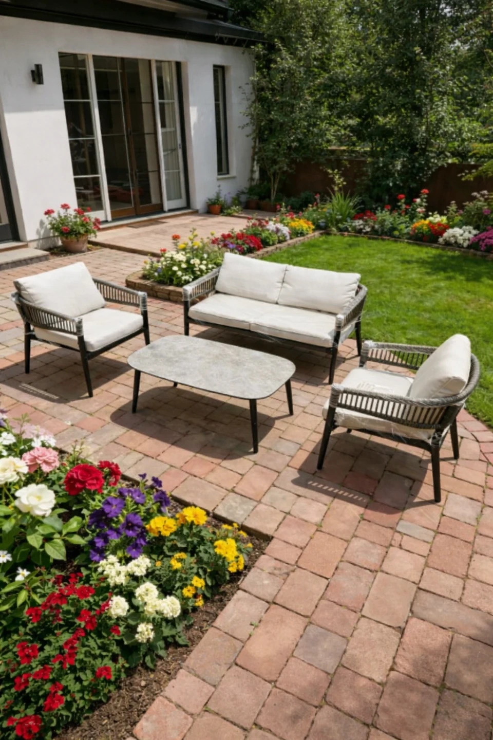 Summer is approaching! Four-piece outdoor patio furniture set. Includes two chairs, a loveseat, and a coffee table. Cushions are water-repellent. Brand new