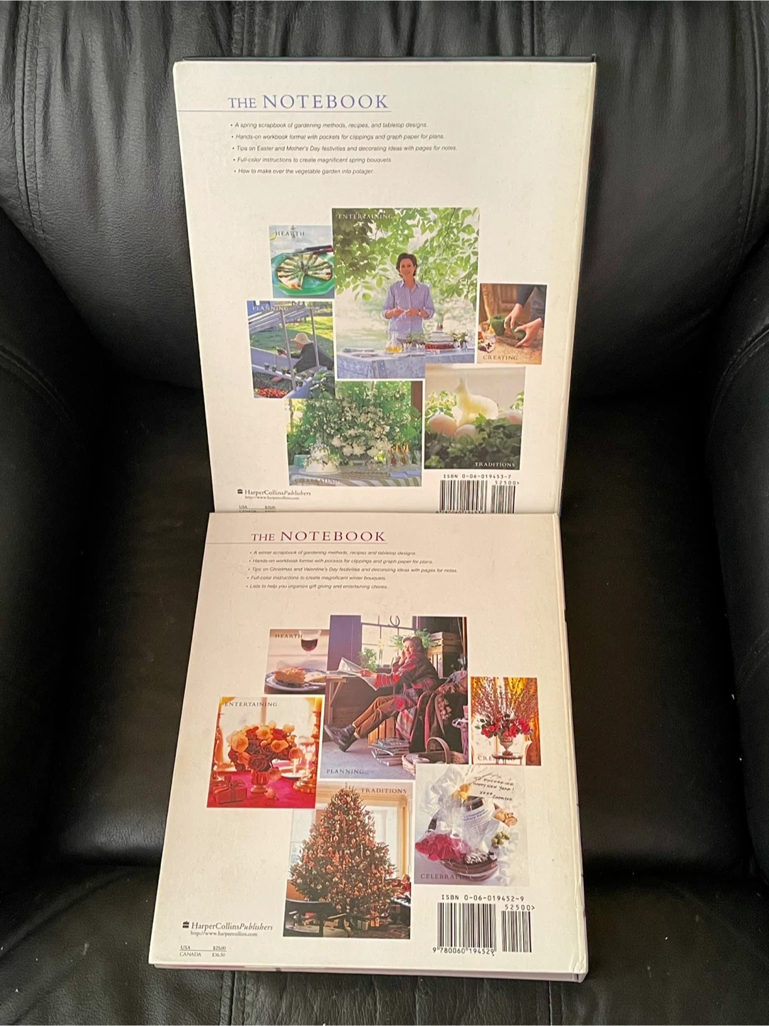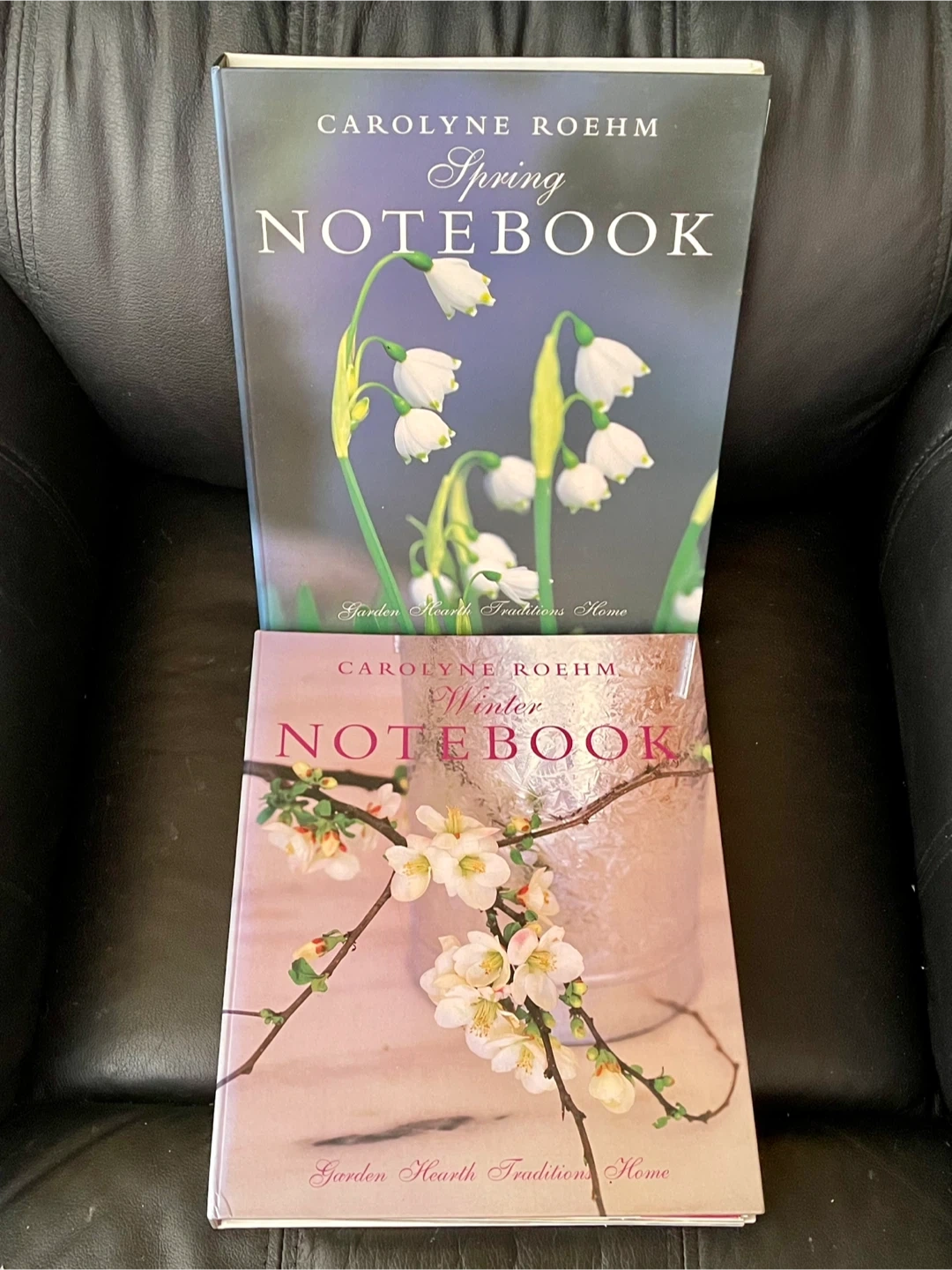 This collection features two Carolyne Roehm notebooks: 'Spring Notebook' and 'Winter Notebook'. They're part of the 'Garden Hearth Traditions Home' series. These books are springboards for gardening methods, recipes, and tablescape designs. Both books are in very good condition with clean pages and no notations. The spring notebook has a gift inscription. Each is 140 pages full of beautiful colour photographs, recipes, flower arrangements, decor designs, peaches to make your own notes and pockets for storing reference materials. $10 each. $20 for both.
