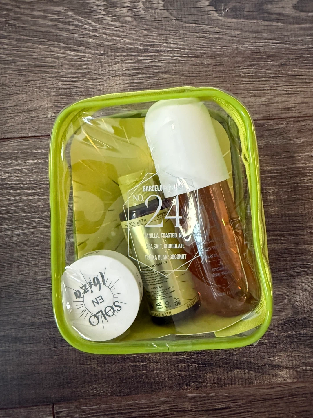 This Barcelona Bliss No. 24 set includes bubble bath, body butter, and fragrance body mist. The bubble bath is 2fl.oz/30mL and the fragrance body mist is 3.4fl.oz/100mL. Body butter is 1.02fl.oz/30g. Great for travel!