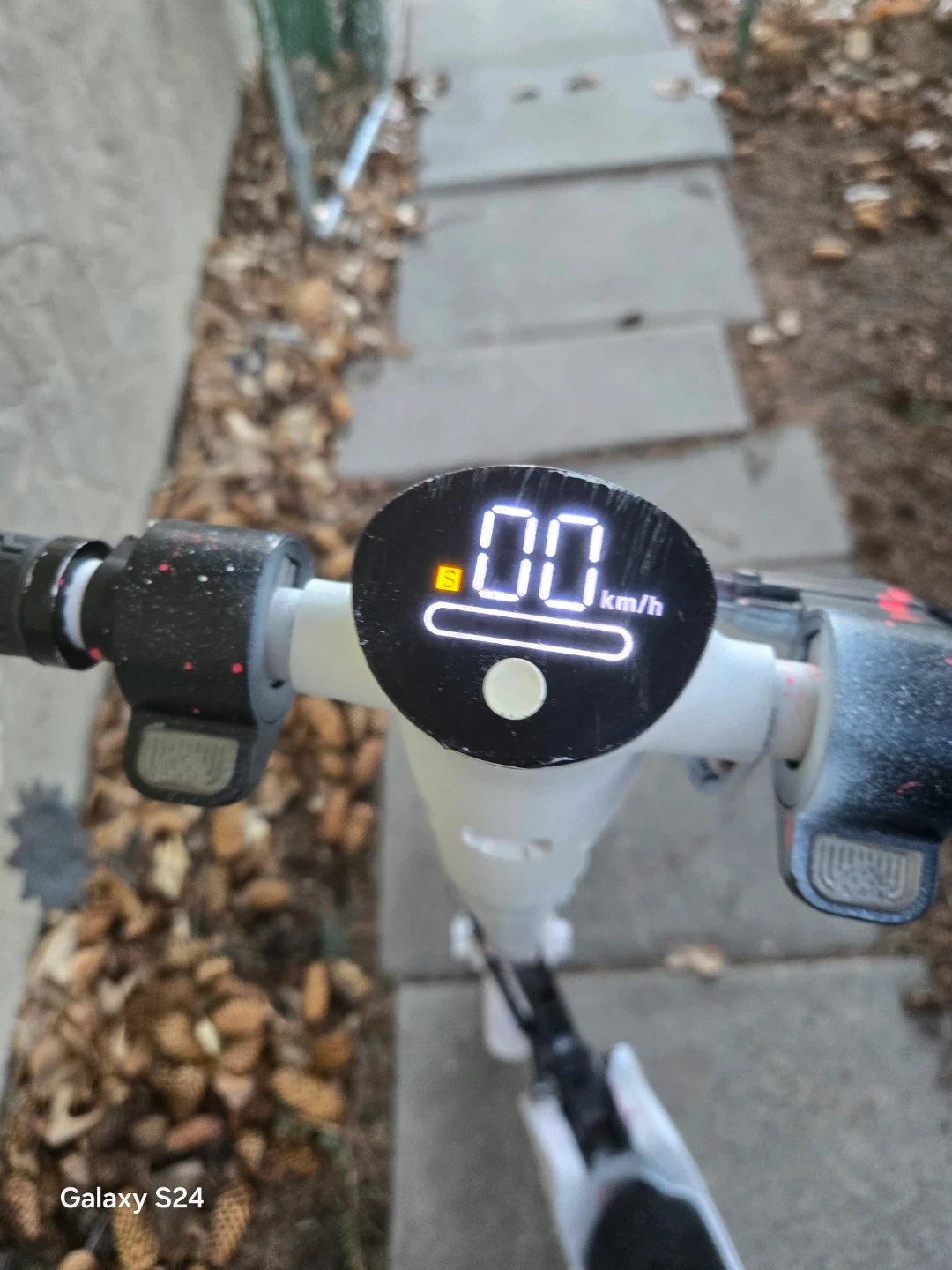 White electric scooter with a digital display. Features a kickstand and foldable handlebars. Great for zipping around town! Needs power cord