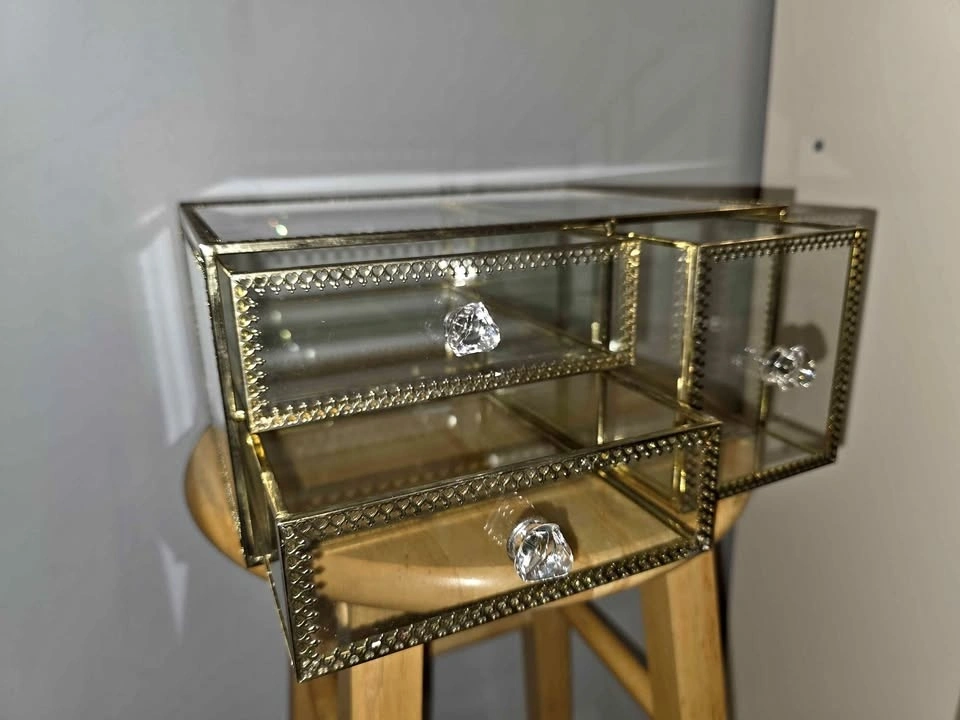 Chic glass organizer with a pretty gold metal frame. Has three drawers with clear, faceted knob handles. Also has a top section with dividers. Great for makeup, jewelry, or just keeping your desk tidy. ONLY message DATE AND TIME for pickup NOT responding to “is this available?” LOCATION PICKUP: Mt.Lehman/Bluejay St. area ABBOTSFORD PRICE FIRM FCFS NO HOLDS EXCEPT FOR ETRANSFERS CHECK OUT MORE LISTINGS ON MY MARKETPLACE PROFILE