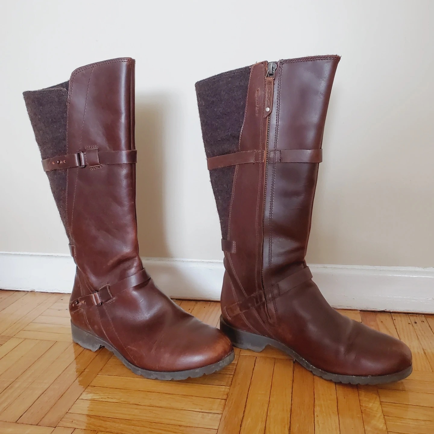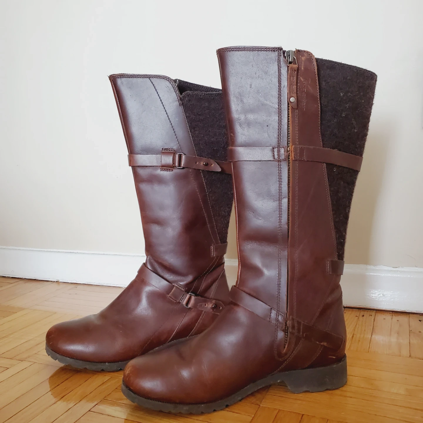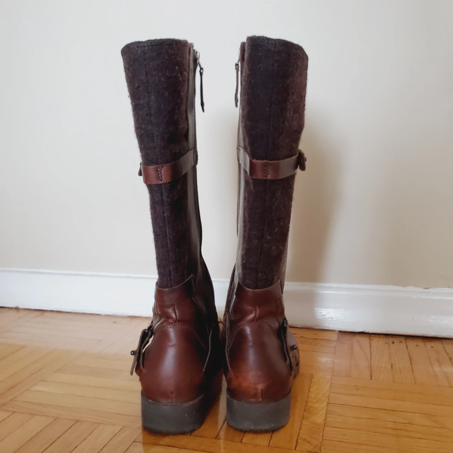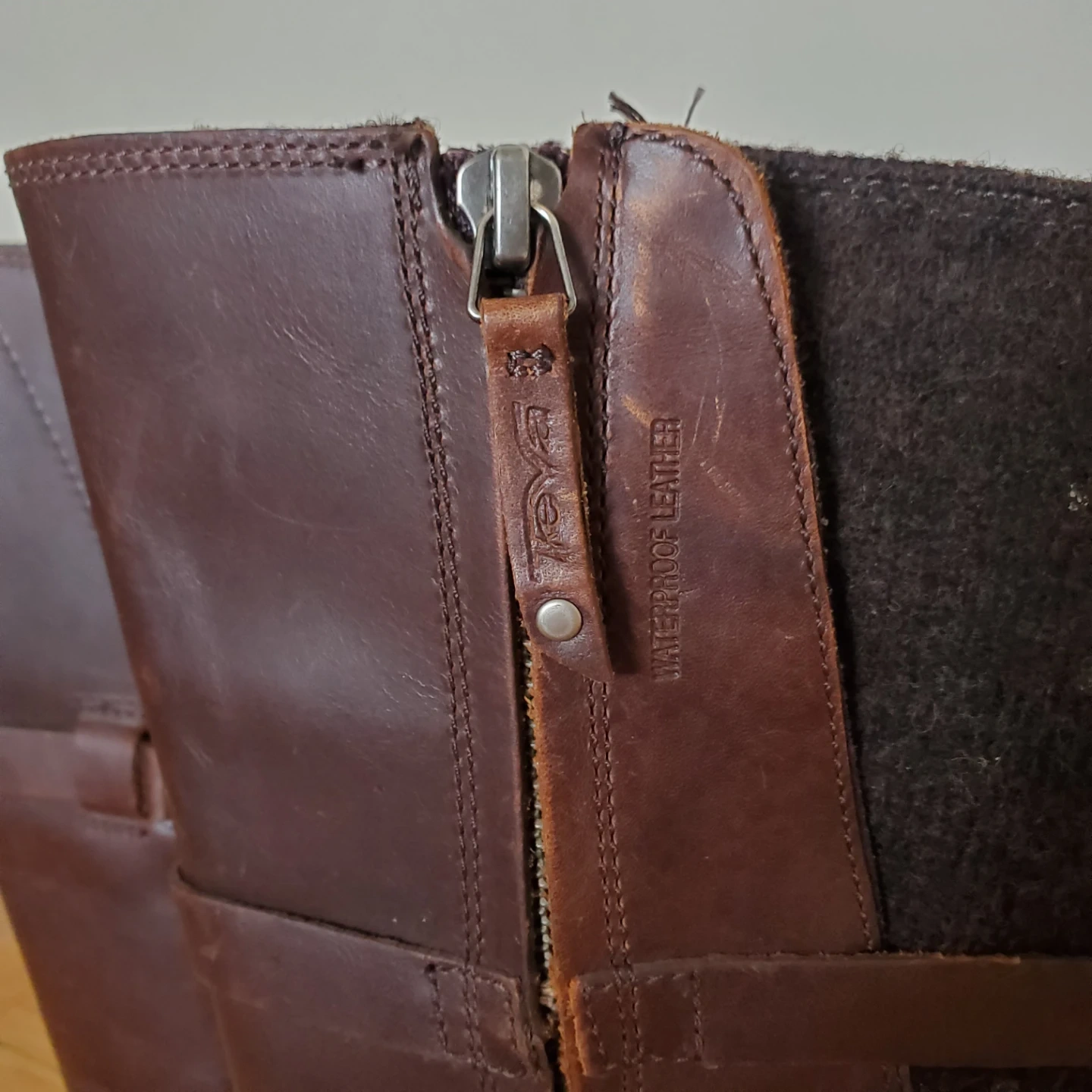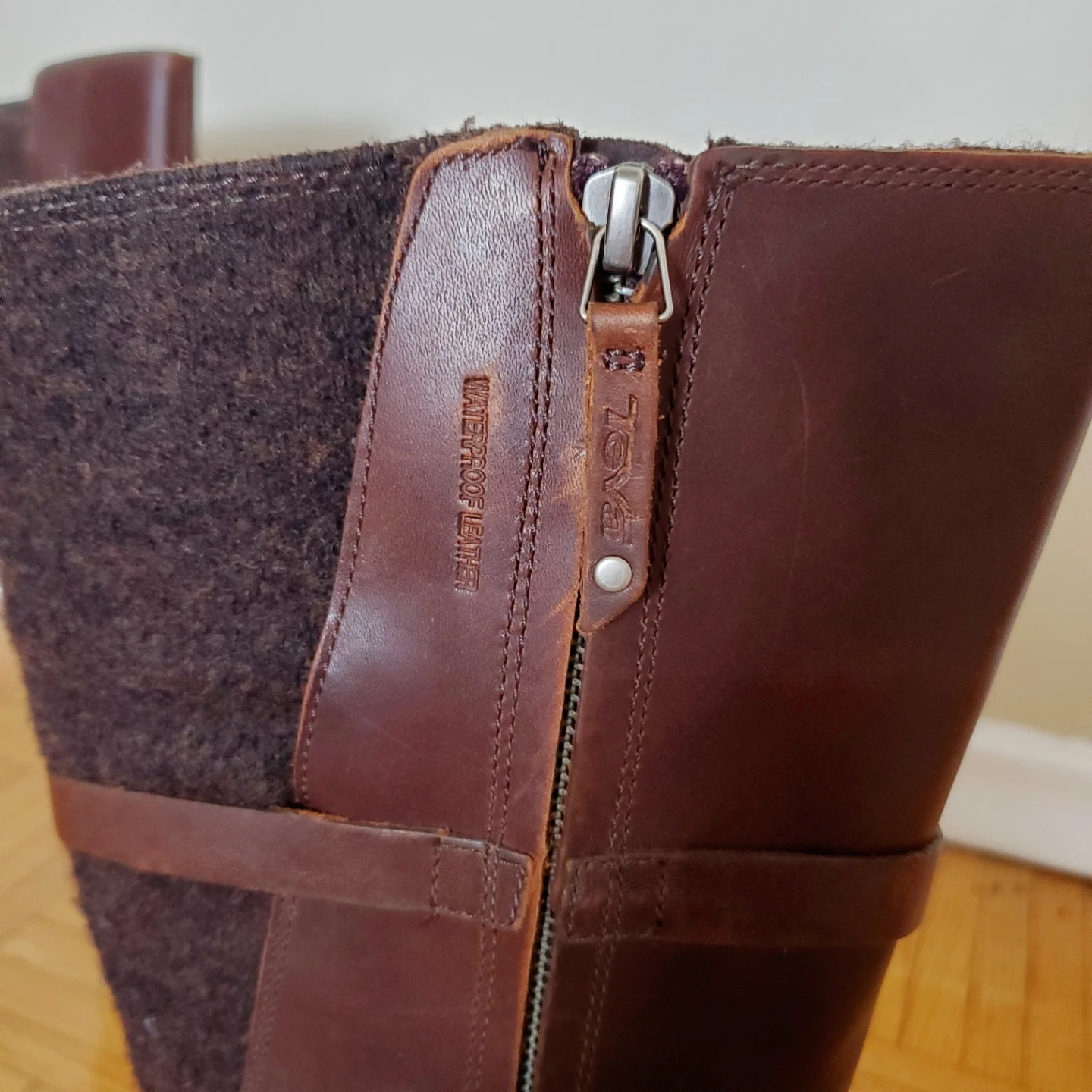These stylish and beautiful brown tall boots are made with waterproof leather and wool. They feature side zippers for easy wear. Perfect for keeping your feet warm and dry in the winter or fall.