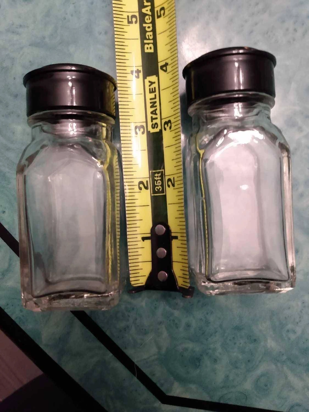 1. Salt and Pepper shakers with black hard plastic lids 4 inches tall