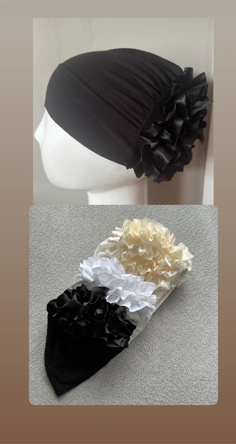 A chic headwrap designed for comfort and style. It features a soft fabric with a beautiful satin ruffle flower accent. Available in black, white, and cream.
