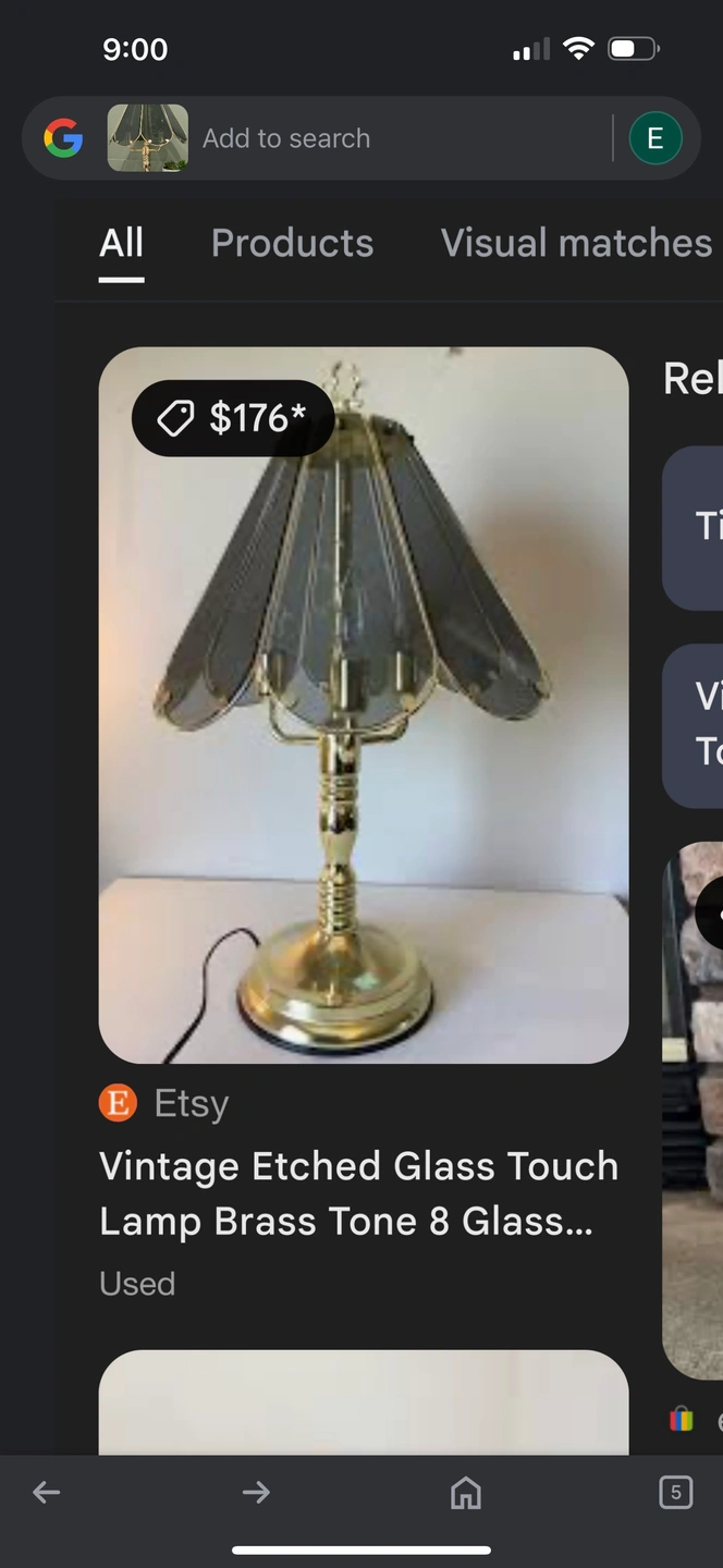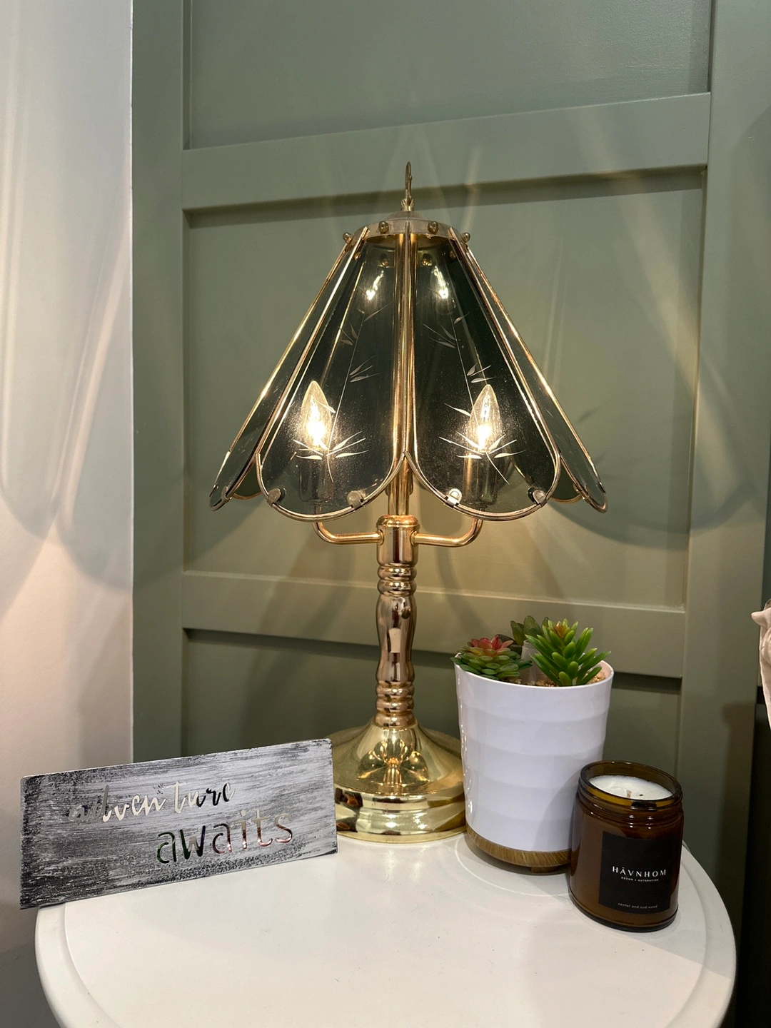A vintage table lamp with an etched glass shade. The lamp has a brass base and is in good condition.