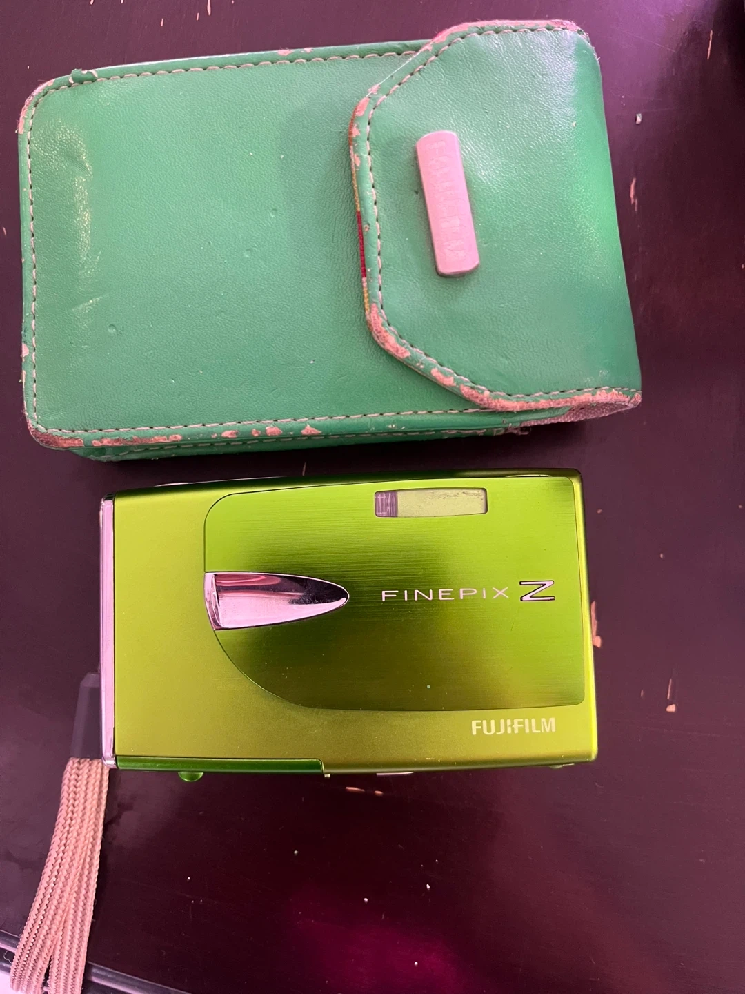 Fujifilm digital camera in a vibrant green colour. Comes with a matching green case for protection.