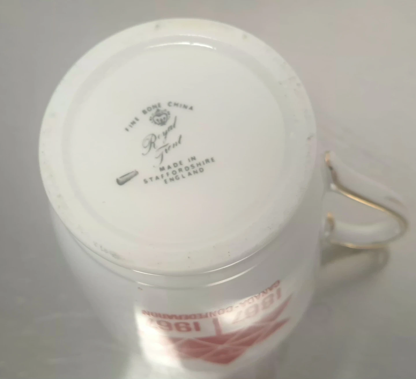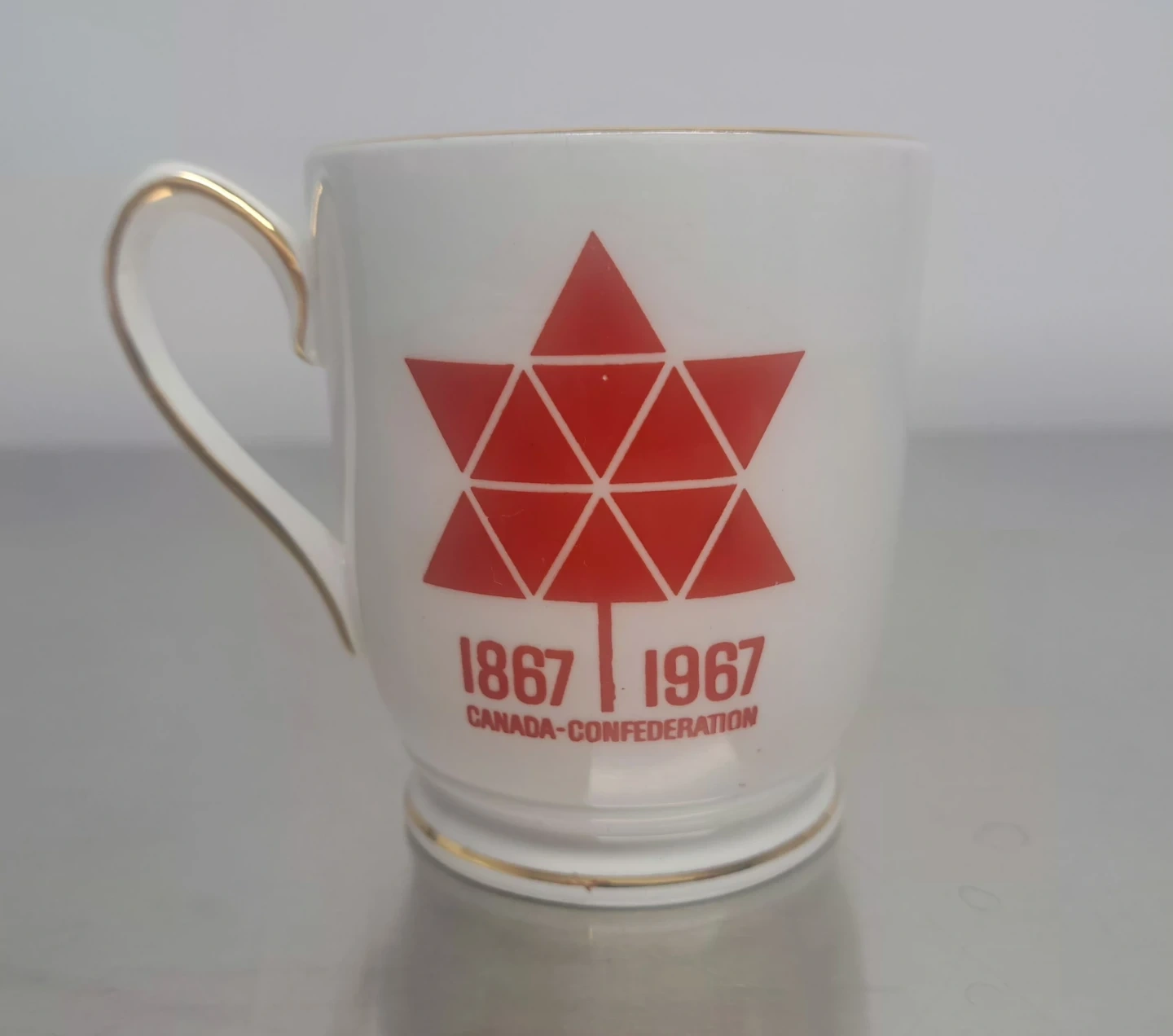 This set celebrates the 1967 Centenial of Canadian Confederation. It includes a fine bone china mug made in Staffordshire, England, and a commemorative pin and coin. The mug features the stylized maple leaf symbol and dates 1867-1967.