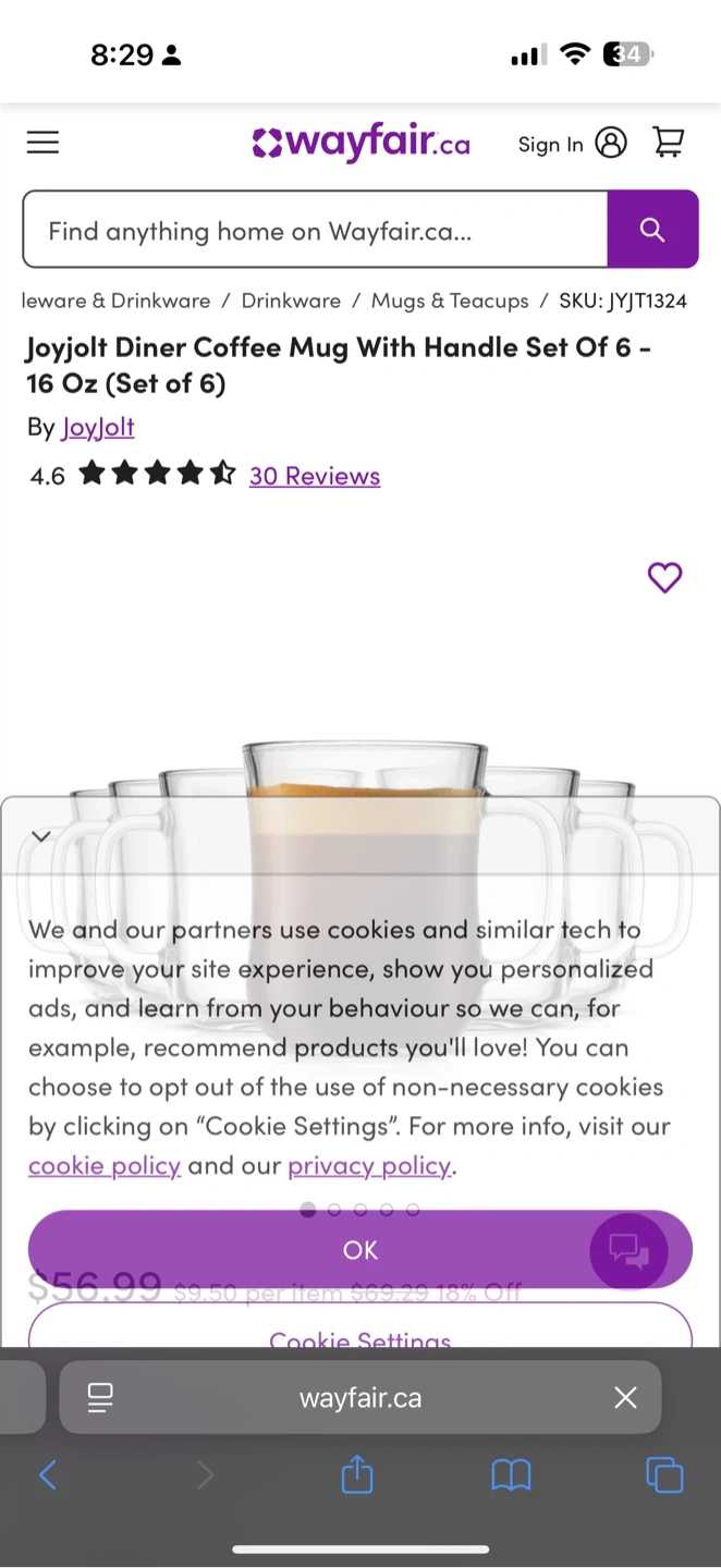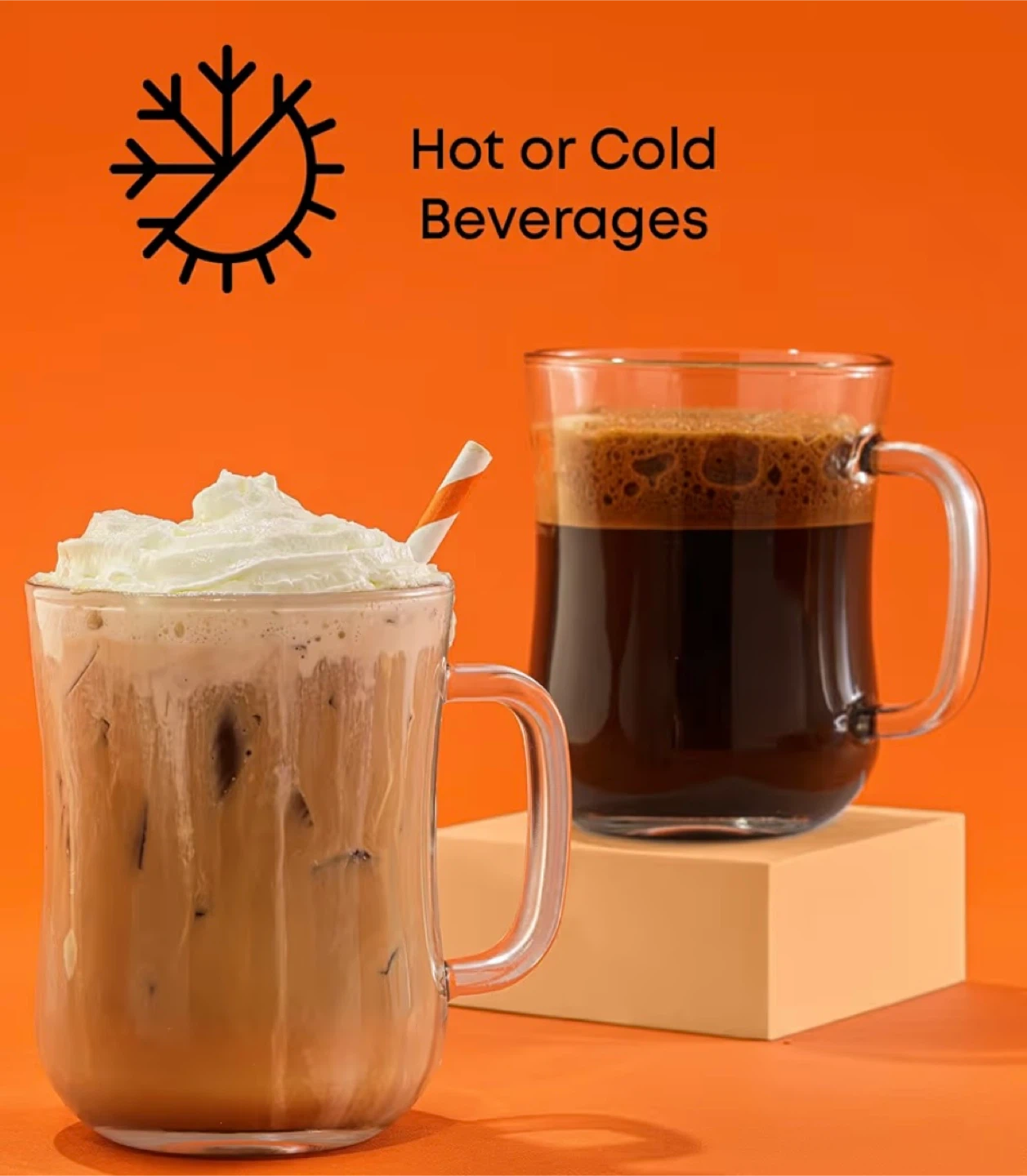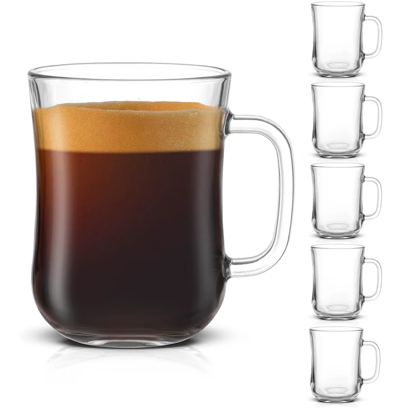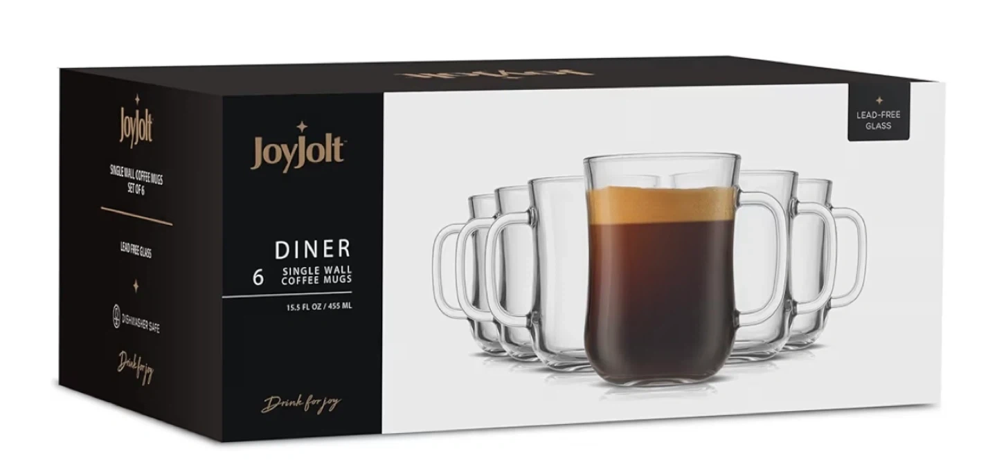 These brand new JoyJolt Diner set of 6 single wall coffee mugs, each with a 15.5 oz (455 ml) capacity, perfect for enjoying your favourite beverages. This set is brand new in the box, never been used! These mugs are lead-free glass, dishwasher safe and can be used for hot or cold beverages.