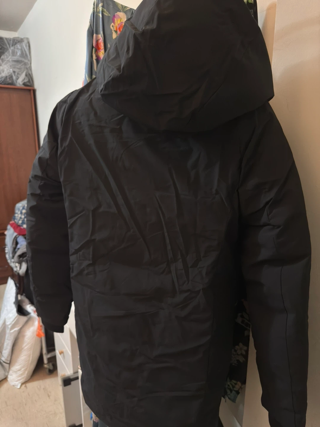 This is a black winter jacket with a hood. It's designed for cold weather. The material is durable and water-resistant. Perfect for staying warm on chilly days! Never worn. Bought from Reitman’s, size extra extra small. Message if interested!