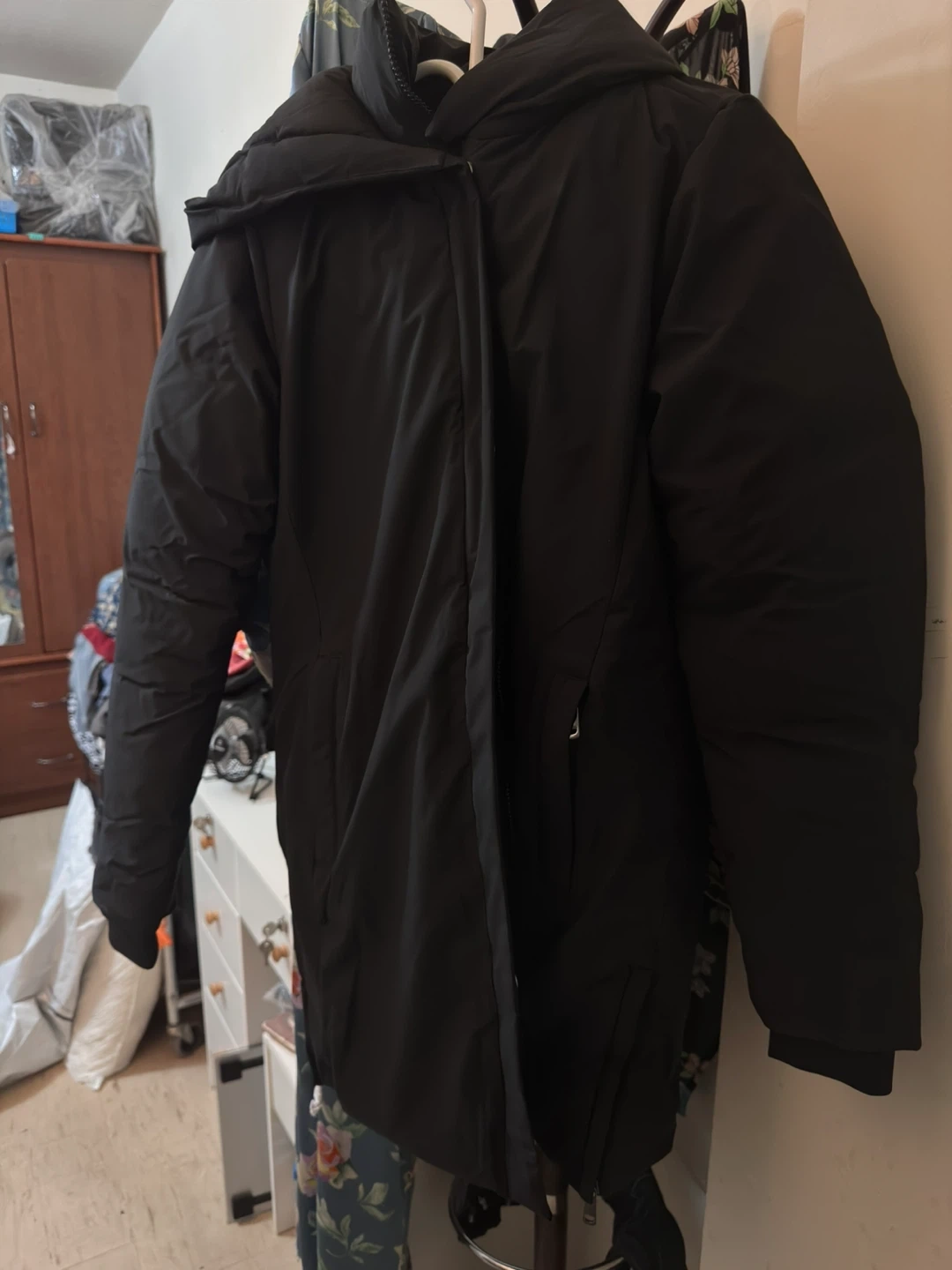 This is a black winter jacket with a hood. It's designed for cold weather. The material is durable and water-resistant. Perfect for staying warm on chilly days! Never worn. Bought from Reitman’s, size extra extra small. Message if interested!