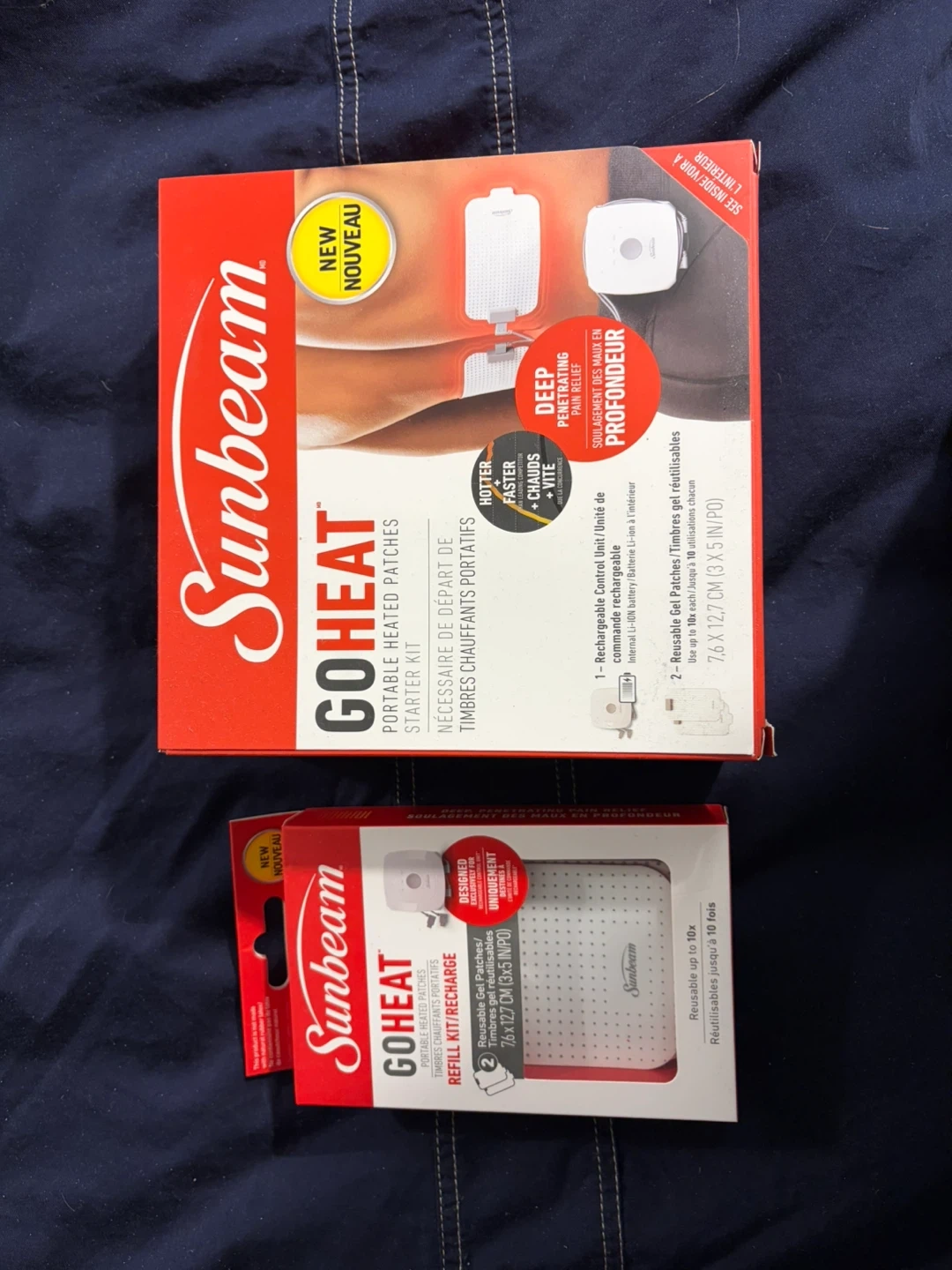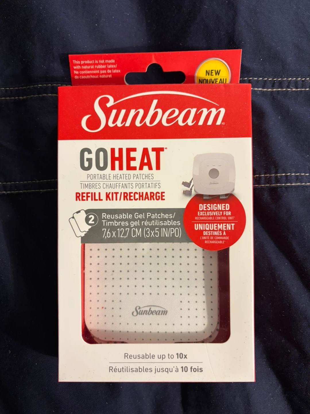 Sunbeam GoHeat portable heated patches starter kit and refill kit. Includes one rechargeable control unit and two reusable gel patches. Patches are 7.6 x 12.7 cm (3x5 in).