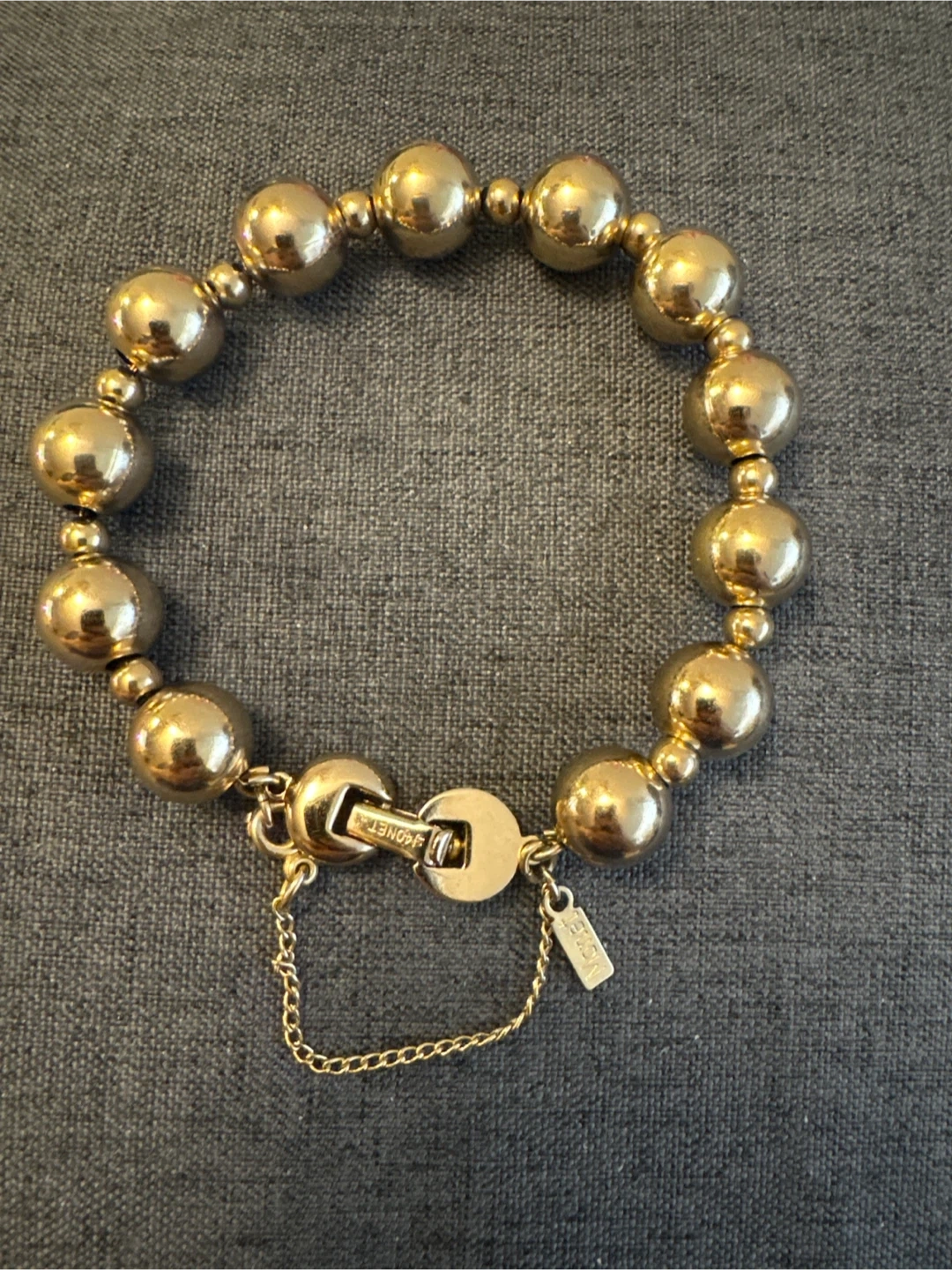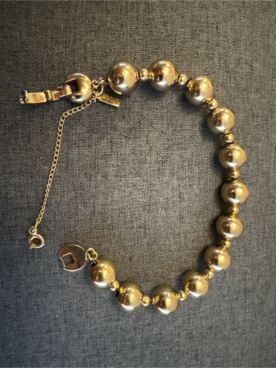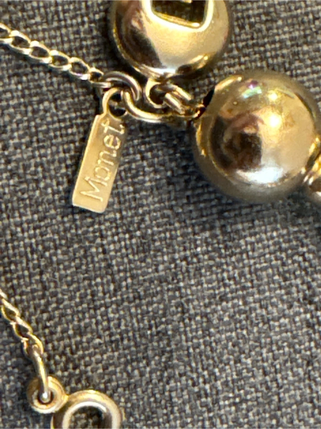 This is a classic gold tone beaded bracelet by Monet. It features large, shiny beads interspersed with smaller accent beads, and a secure clasp. The bracelet has a safety chain for added security.