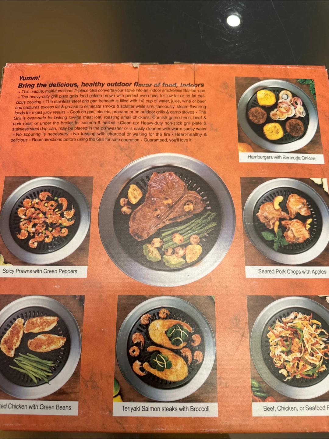 Bring the delicious, healthy outdoor flavour of food indoors! The heavy-duty grill plates give food golden brown with perfect even heat for low-fat or no fat deli-cious cooking. The smokeless grill drip pan fills with just an inch of water to catch fat and drippings, preventing smoke and spatter while simultaneously flavouring foods. Cook on gas, electric, propane or on outdoor grills & camp stoves. The non-stick grill plate & seamless pan make cleaning a breeze. Guaranteed, you'll love it!