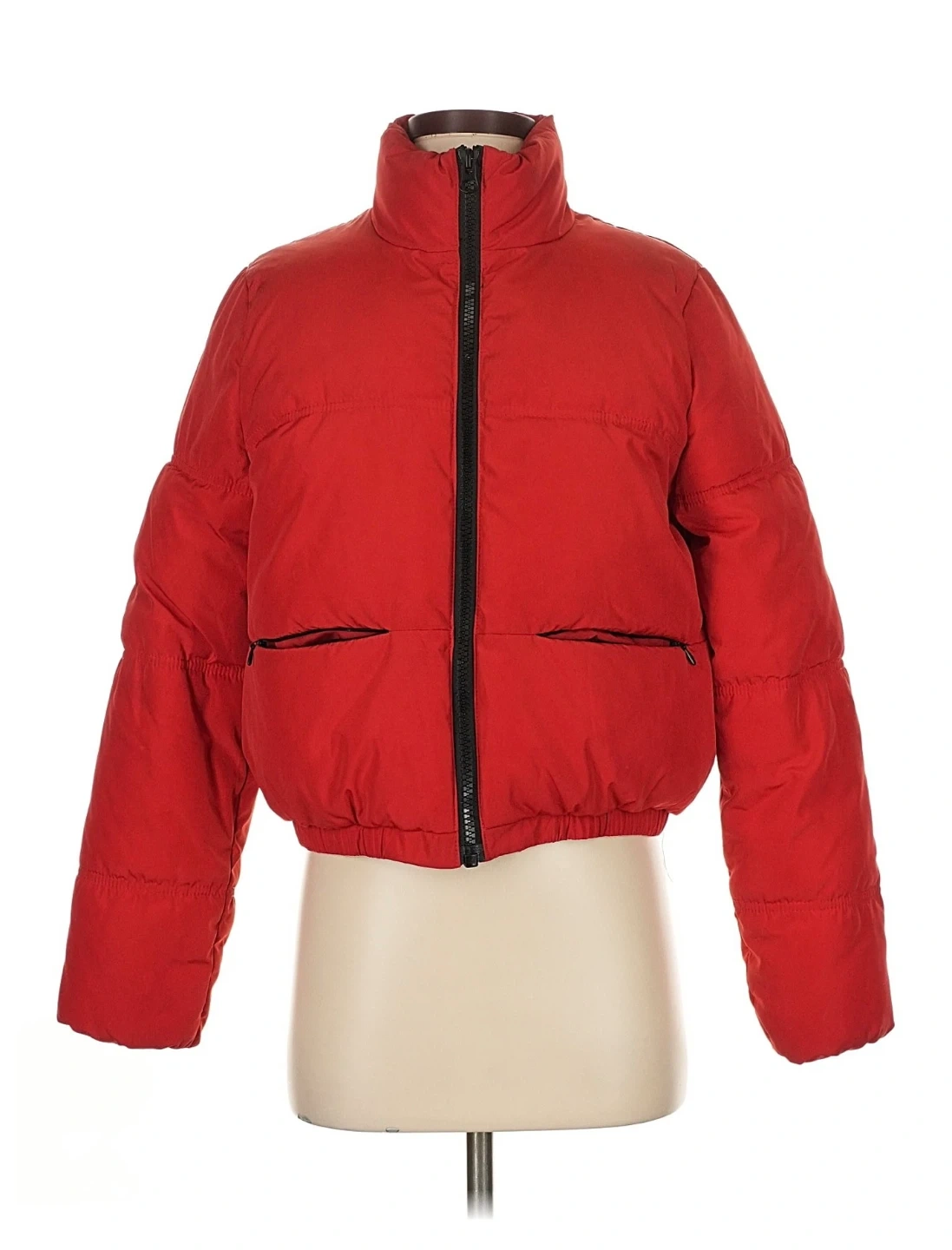 Classic red puffer jacket with a zip-up front and elastic cuffs. It features two zip pockets on the front. This jacket is perfect for keeping warm during cooler weather!