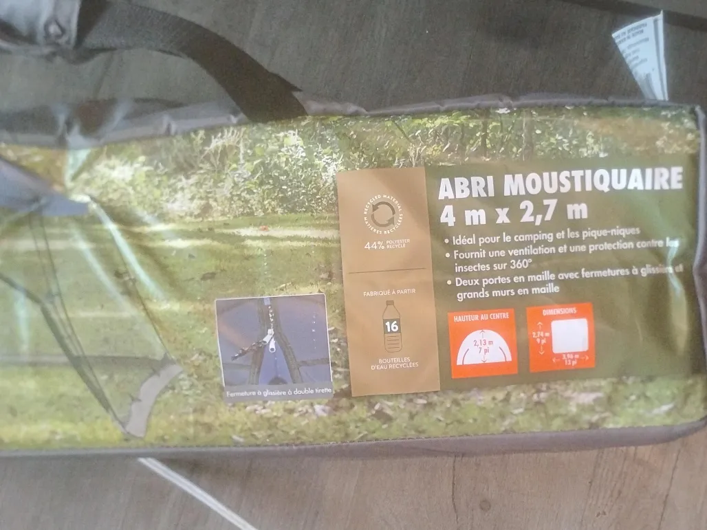 Selling an Abri Moustiquaire, perfect for camping and picnics! It measures 4 m x 2.7 m and provides ventilation and protection against insects from all angles. It also features two mesh doors with zippers and large mesh walls