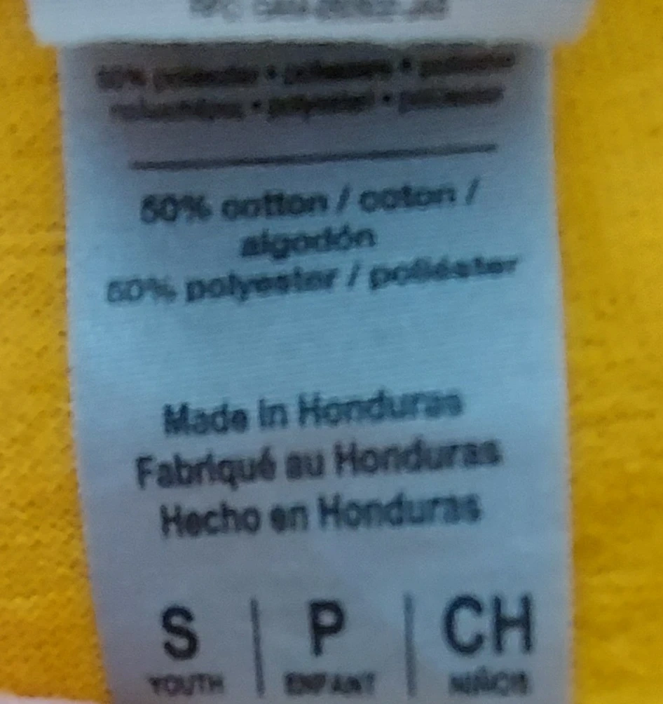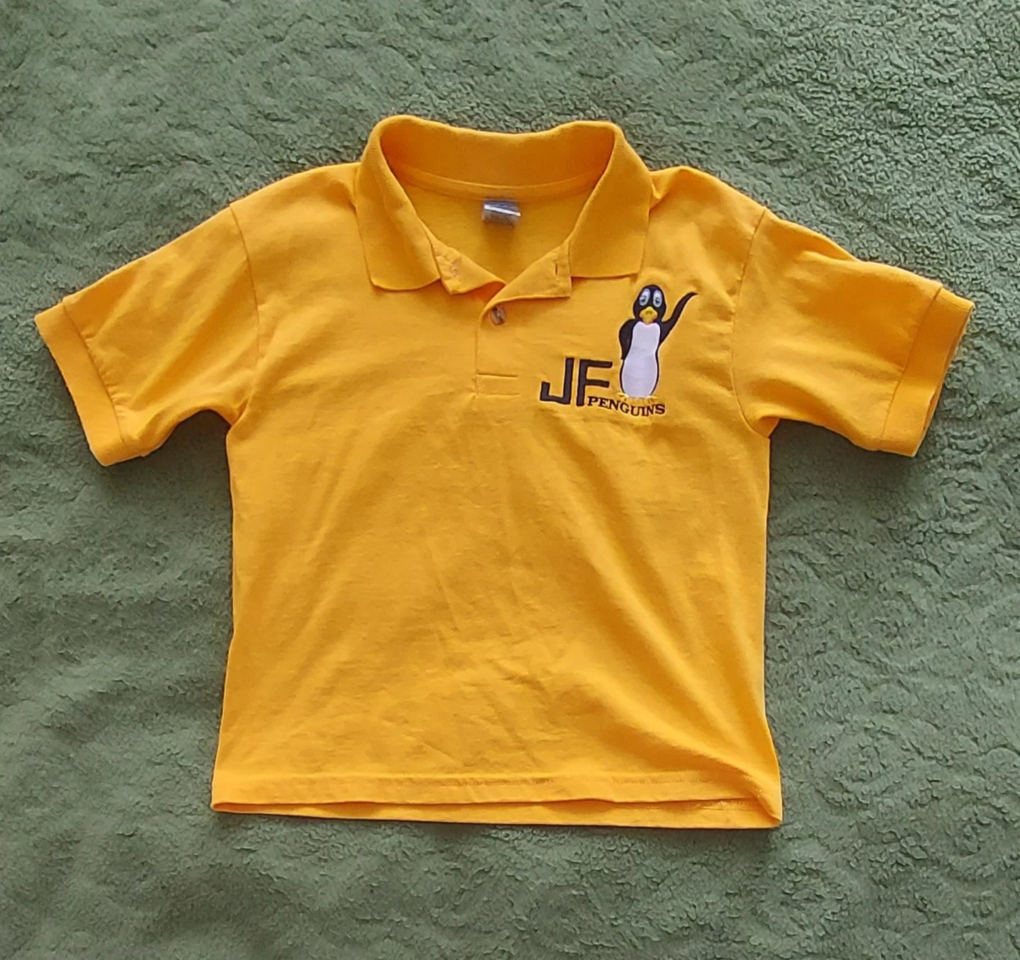 Yellow short-sleeved polo shirt with a JF Penguins logo. It's made of 50% cotton and 50% polyester. Made in Honduras. Size is Youth S.