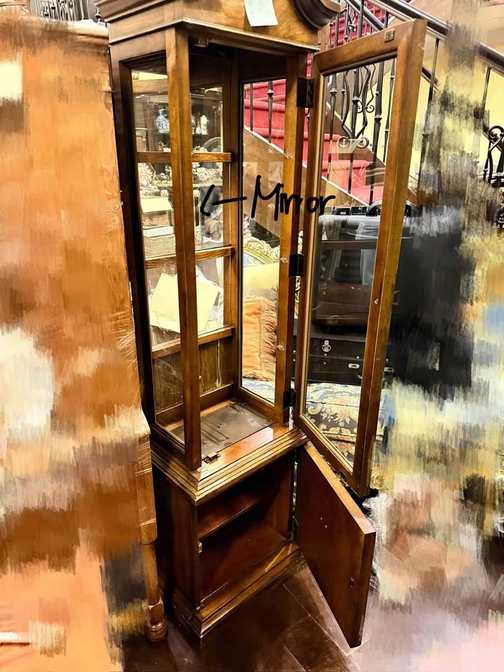 Slender solid-wood display cabinet with a warm medium-brown finish and full glass door, ideal for showcasing collectibles, crystal, or small antiques. Features interior glass shelving, mirrored back for enhanced display, and a lower enclosed storage compartment. Traditional styling with clean lines; structurally sound with light, age-appropriate wear consistent with vintage use.