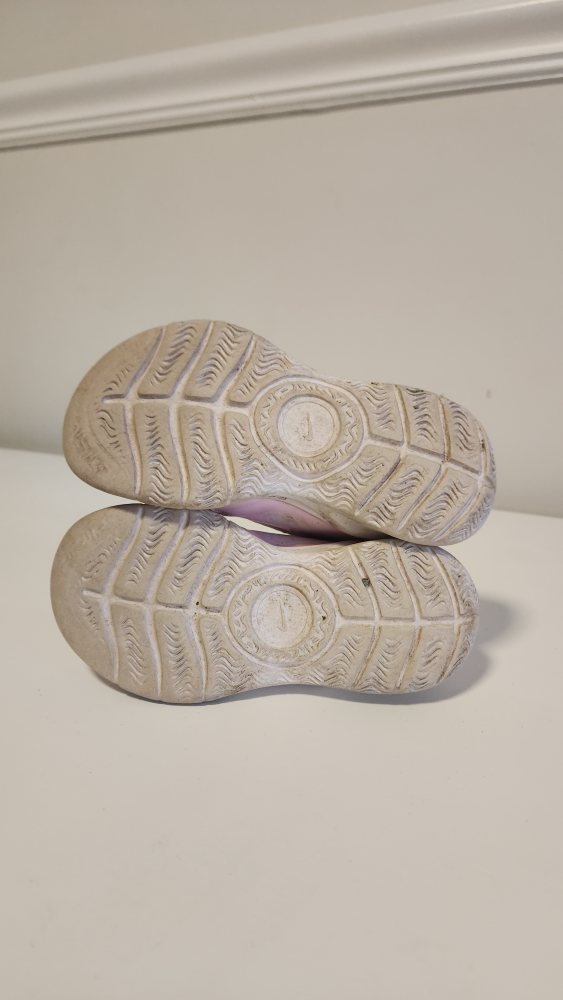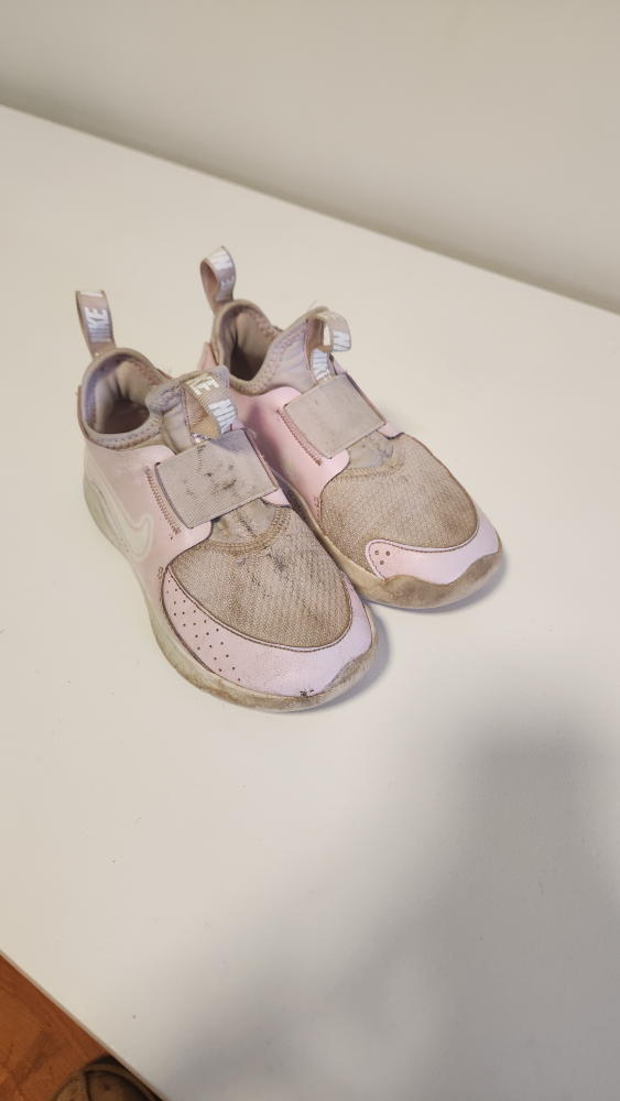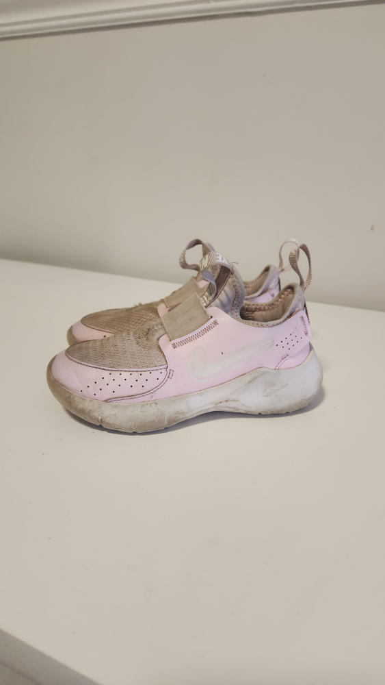 These are a pair of Nike kids' slip-on shoes in pink. They show some signs of wear, as you can see in the photos. Still lots of life left in them!
