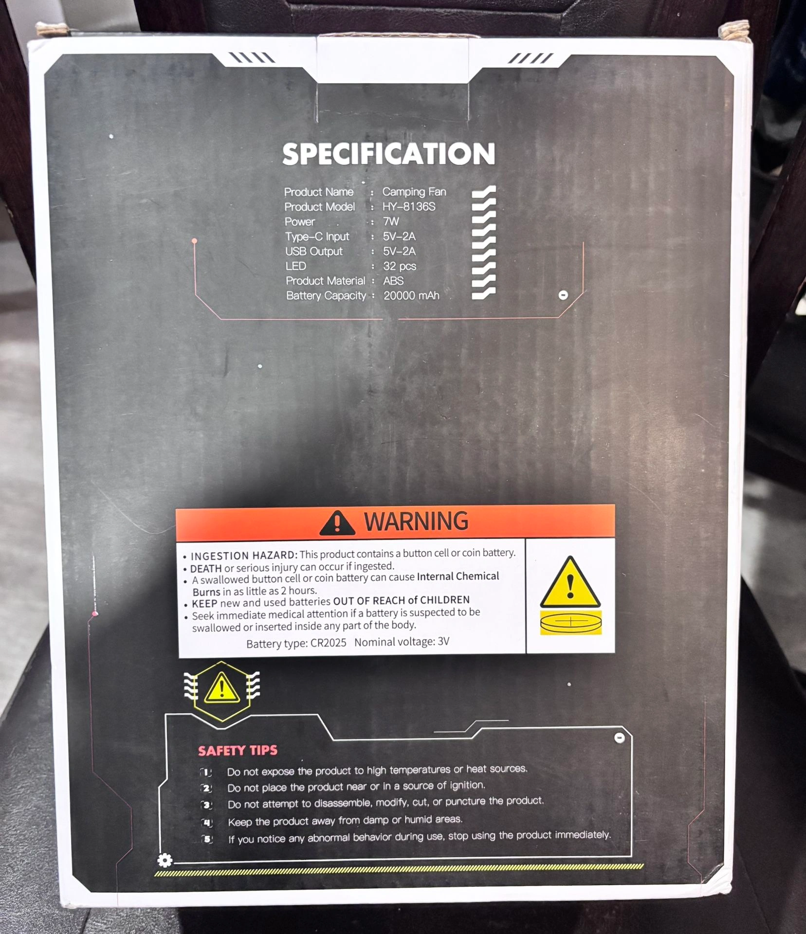 Brand new, never opened in original box. High-power portable camping fan with 20,000mAh rechargeable battery, perfect for camping, emergencies, power outages, travel, or home use. Features strong airflow with multiple speed settings and built-in LED lighting. Features: 20,000mAh rechargeable battery, Dual-blade fan for strong airflow, 8 fan speeds, Built-in LED light with multiple brightness levels, Remote control included, USB-C charging, Can charge phones or small devices, Adjustable angle + hanging hook, Long runtime (up to ~40–50 hours on low setting), Compact & portable design. Condition: Brand new, unused, factory sealed. Great for camping, RVs, tents, power outages, dorms, garages, or emergency kits. Brand: Coldsky.