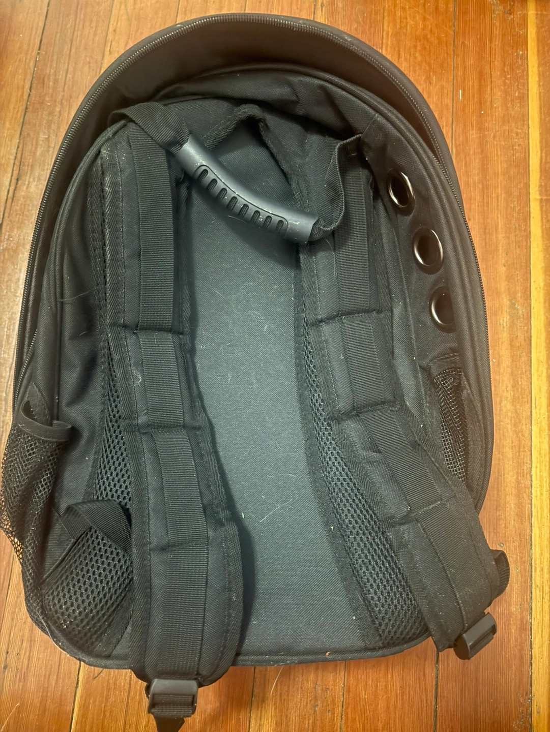 This Lemonada brand bubble backpack has never been used. I put my cat in it once and he hated it, so it has been in storage for a few years. It's pink with a clear bubble window for your cat to look out. It includes a removable mat inside, as well as an alternate black plastic window with holes. I have the original duster bag and instructions. It may be a bit dusty from being in storage, but otherwise in perfect condition.