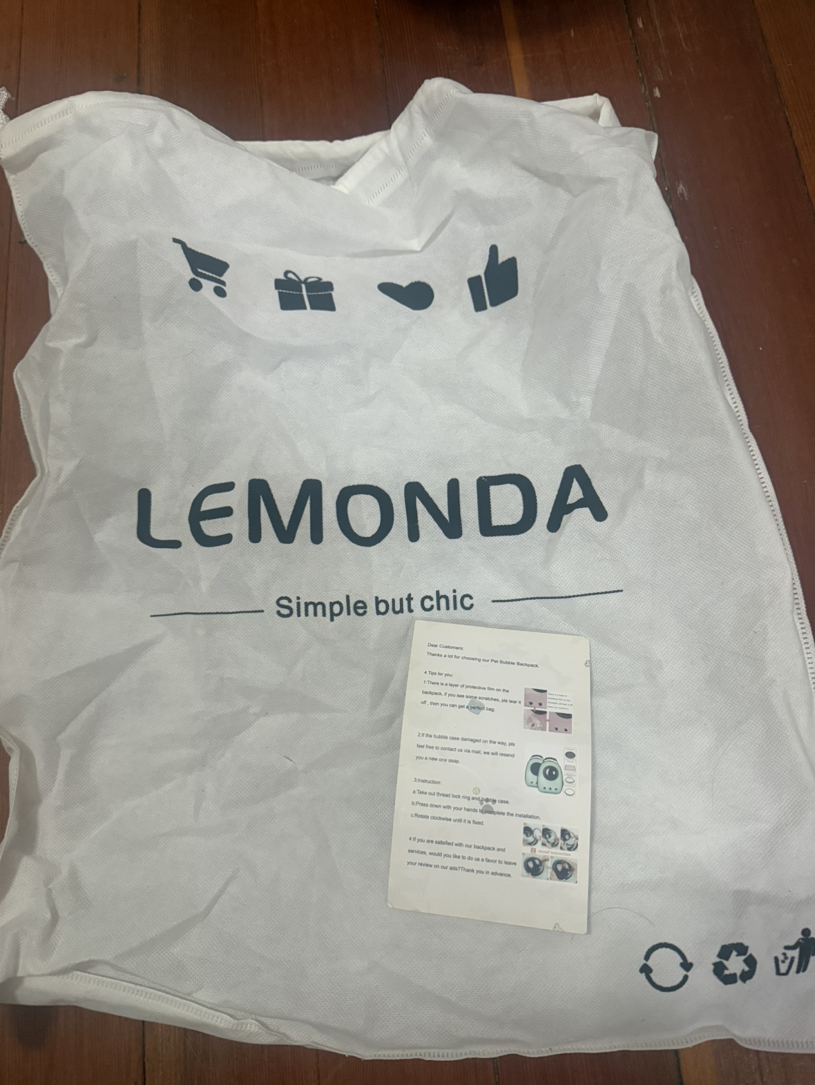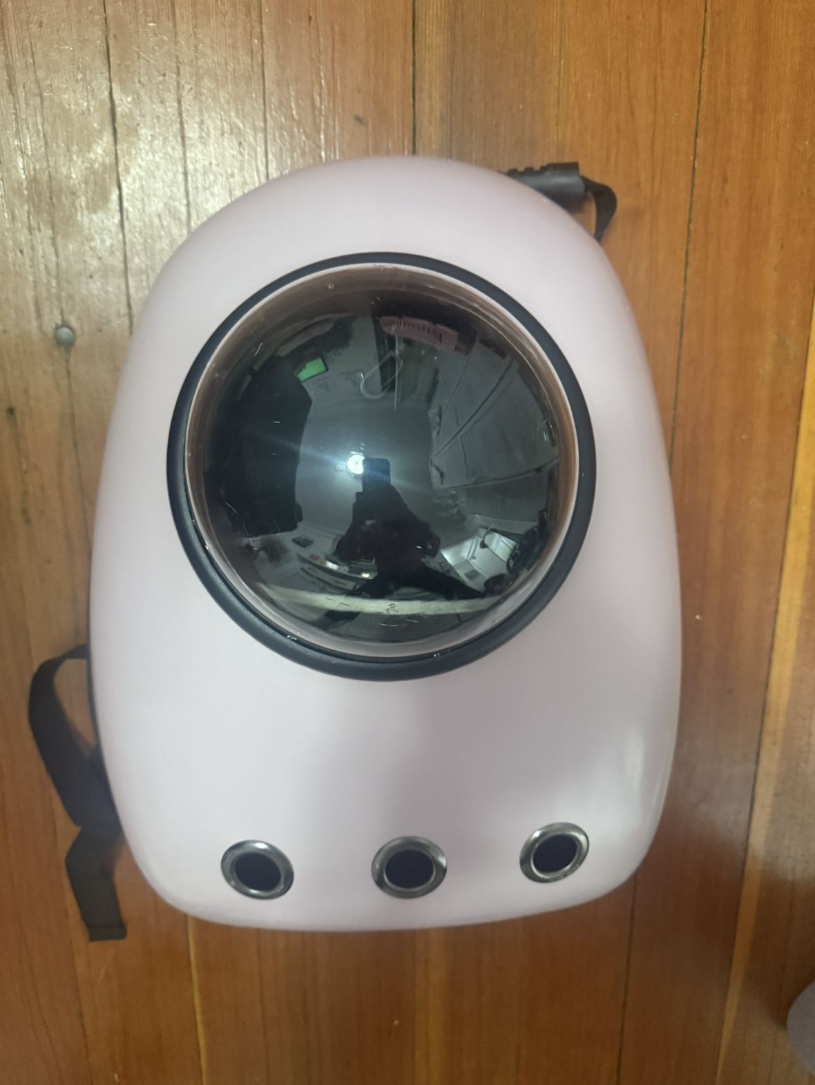 This Lemonada brand bubble backpack has never been used. I put my cat in it once and he hated it, so it has been in storage for a few years. It's pink with a clear bubble window for your cat to look out. It includes a removable mat inside, as well as an alternate black plastic window with holes. I have the original duster bag and instructions. It may be a bit dusty from being in storage, but otherwise in perfect condition.
