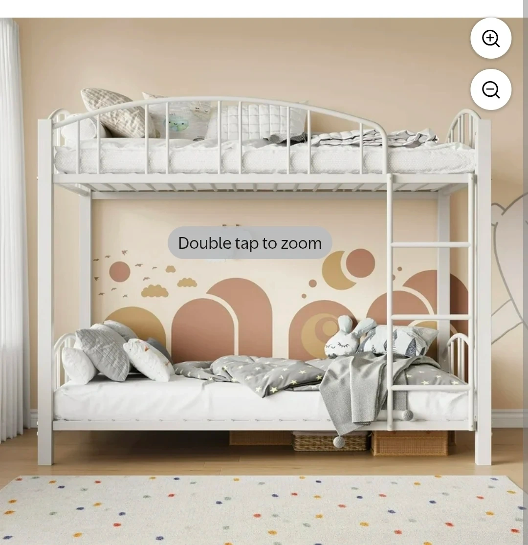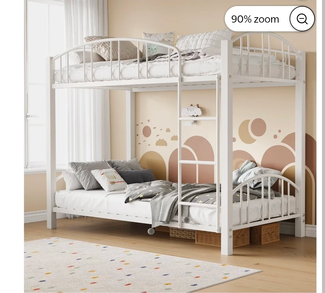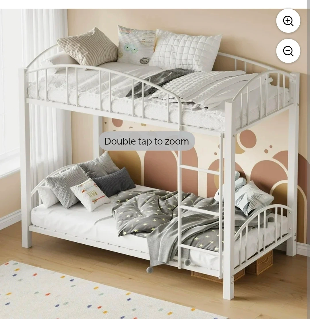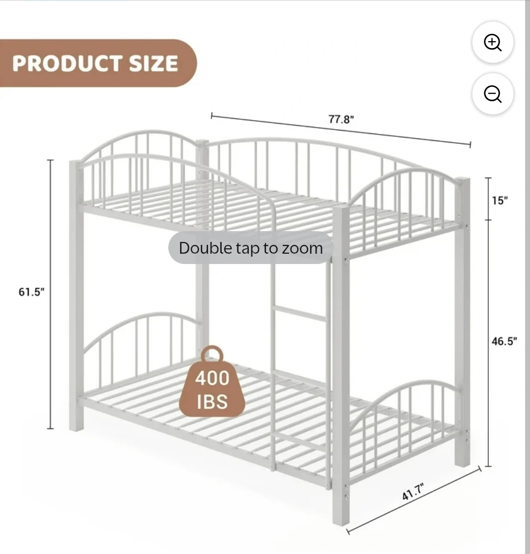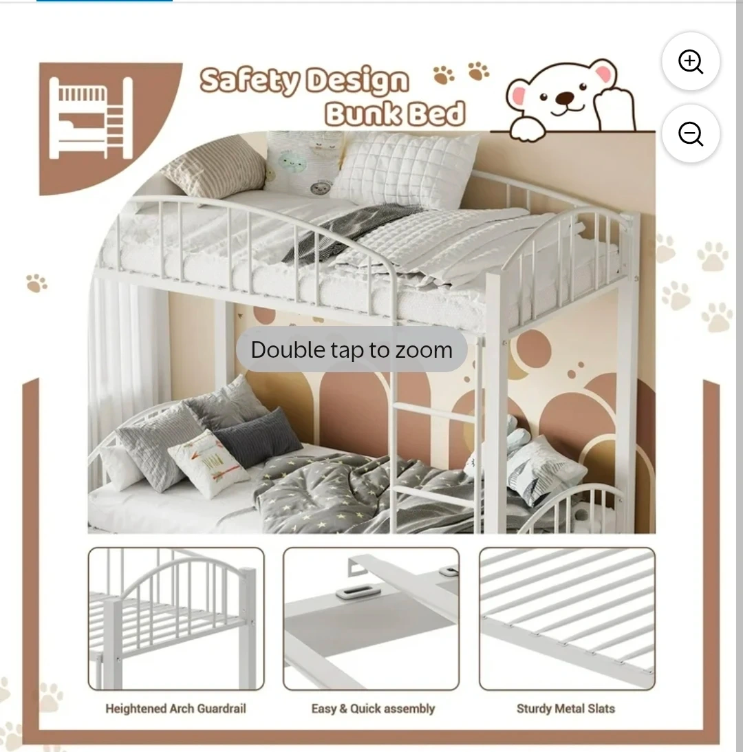Selling a white metal bunk bed with a safety design! It features a heightened arch guardrail, easy and quick assembly, and sturdy metal slats. The dimensions are approximately 77.8" x 41.7" x 61.5".