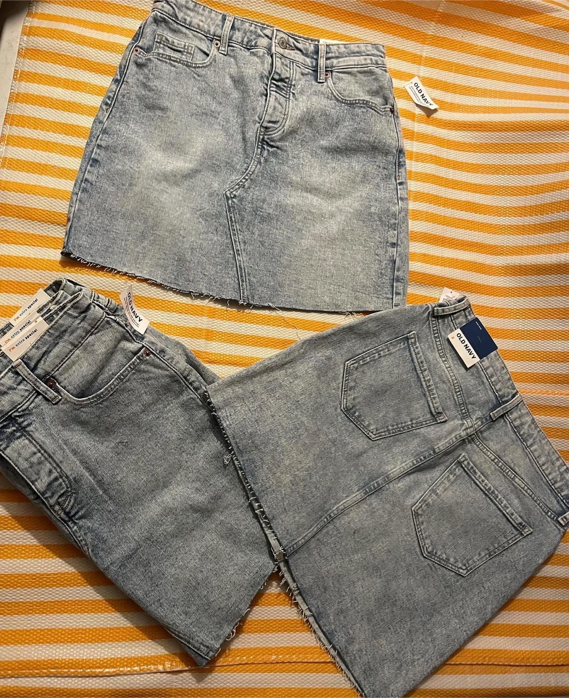 Bundle includes a light wash denim mini skirt and a pair of light wash denim jeans. Both items are from Old Navy. The skirt features a raw hem. The jeans have a classic five-pocket design.