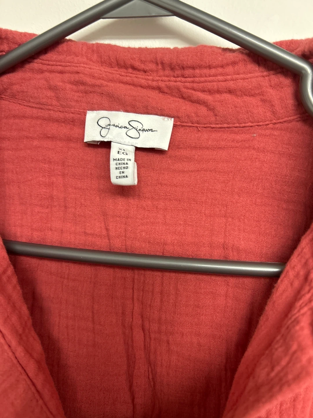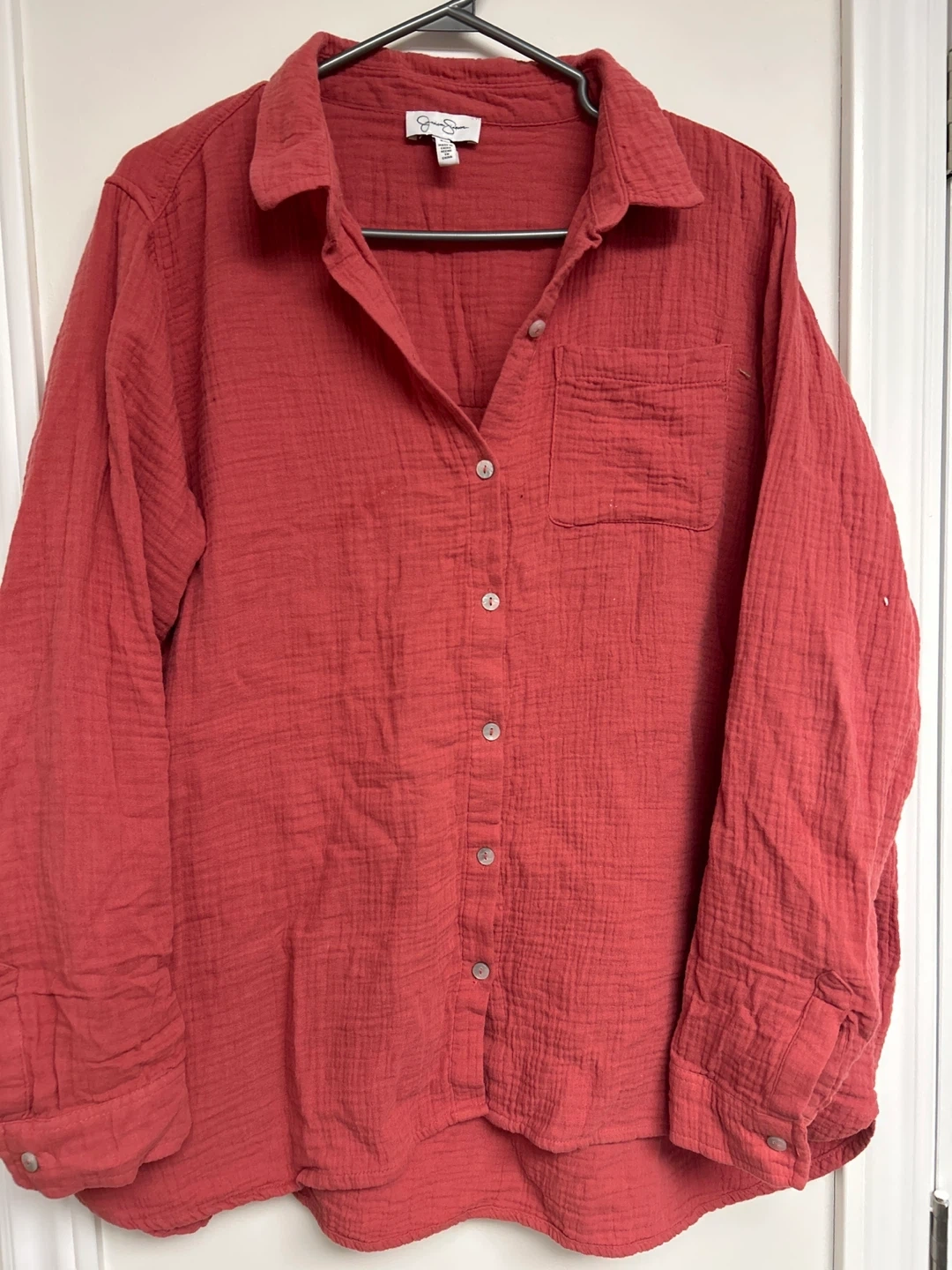 This is a rust-coloured gauze shirt from Jessica Simpson. It's a size XL with a button-up front and a chest pocket. The material is lightweight and breathable.