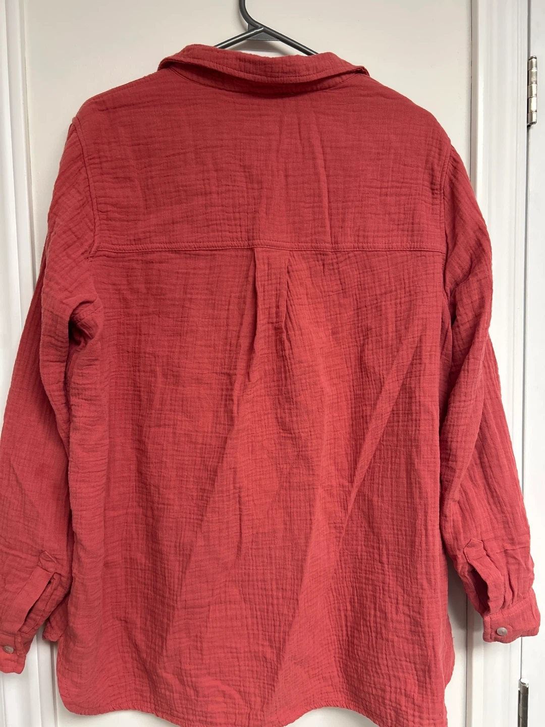 This is a rust-coloured gauze shirt from Jessica Simpson. It's a size XL with a button-up front and a chest pocket. The material is lightweight and breathable.