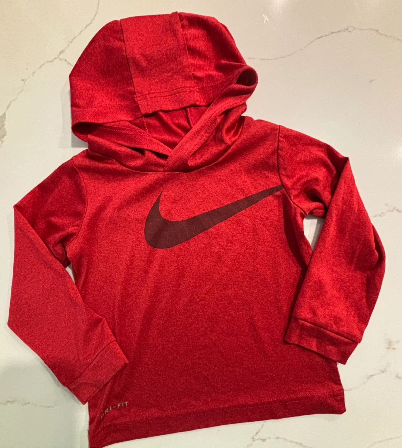Nike hoodie with a large swoosh logo. Made with Dri-FIT fabric. Fits size 2T. Kids' essential for play or sports!