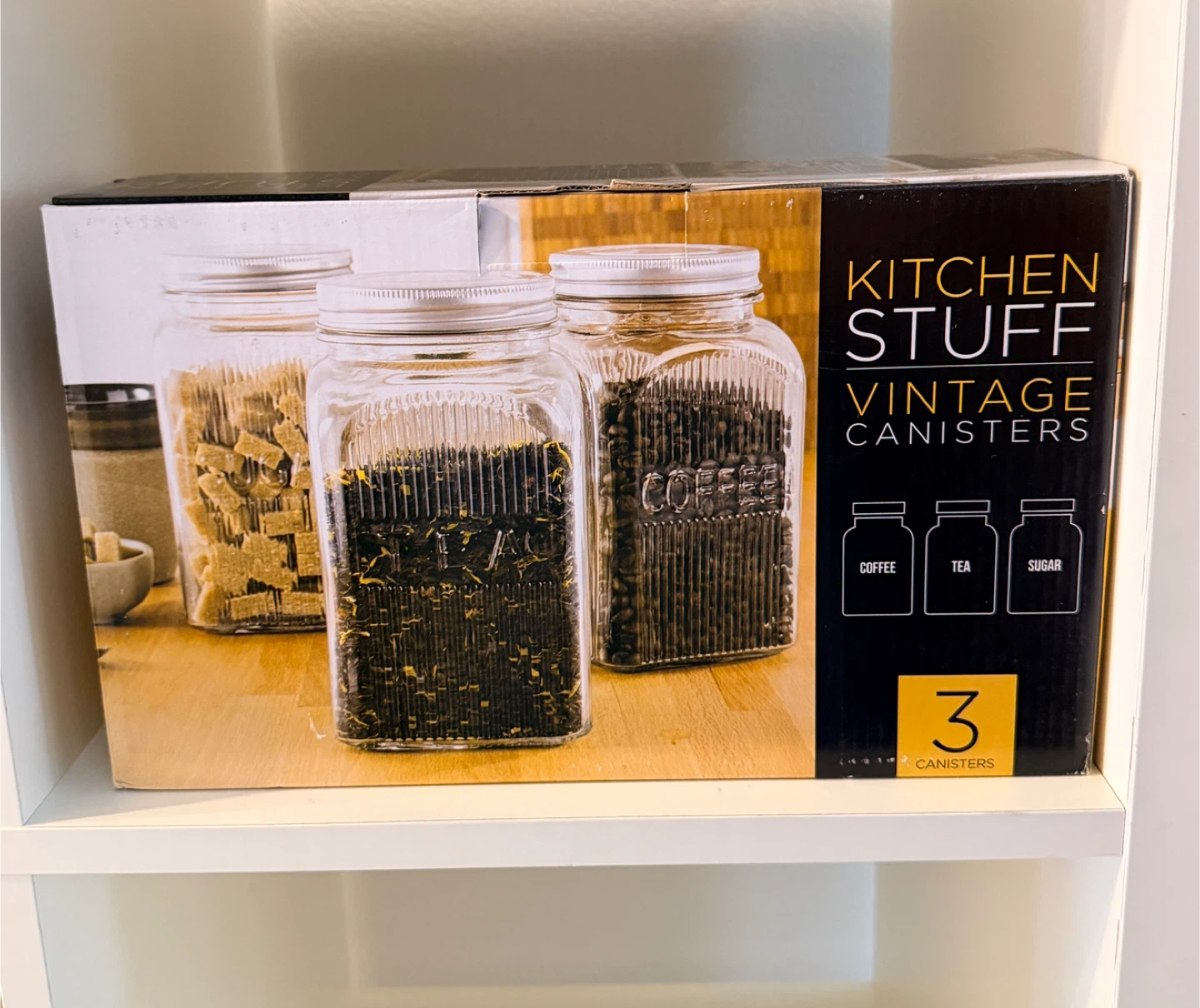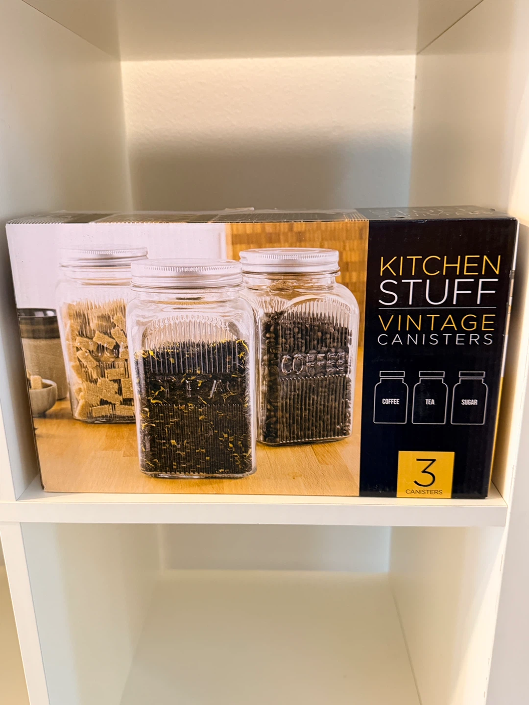 Selling a set of three Kitchen Stuff Vintage Canisters! These Art Deco glass storage jars are perfect for storing coffee, tea, or sugar. They're also great for organizing crafts and office supplies. The box is included!