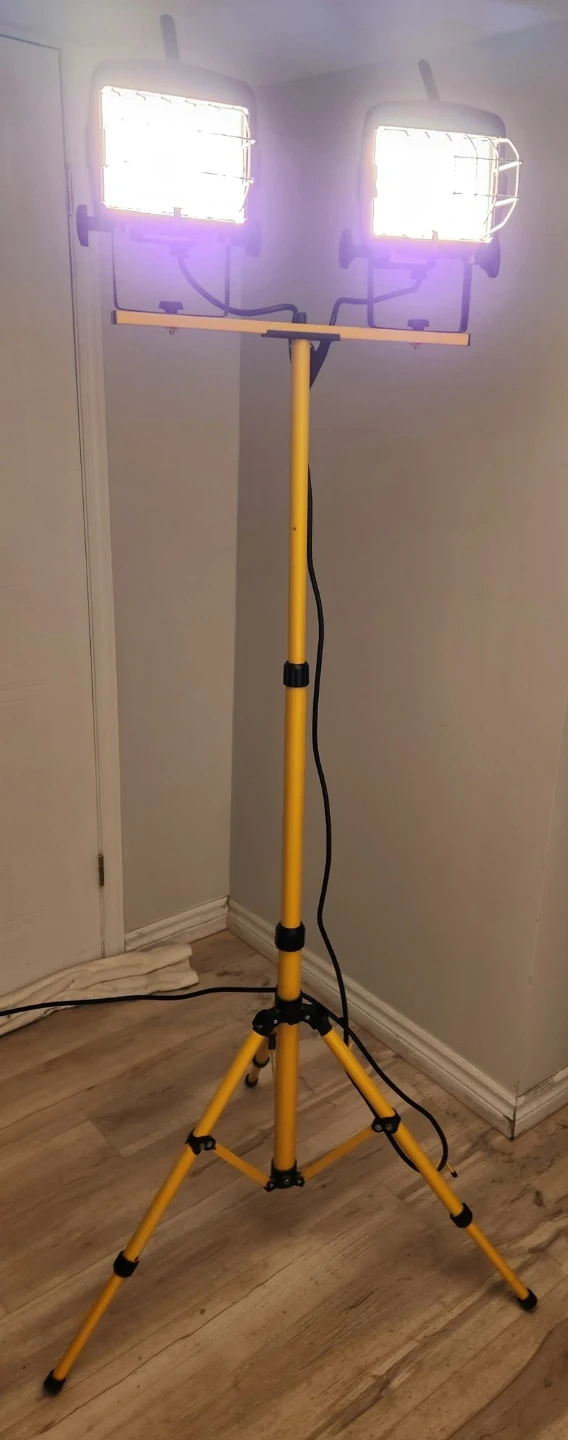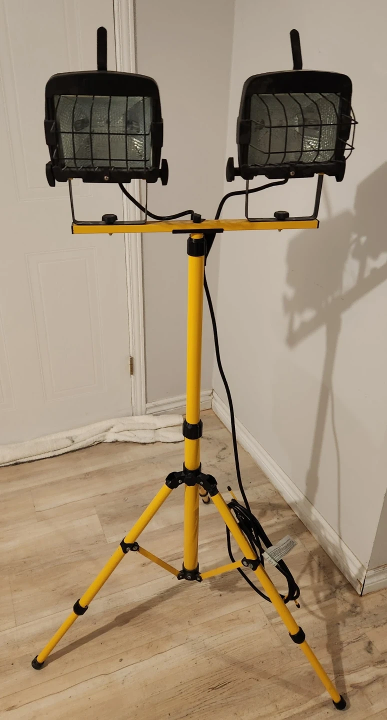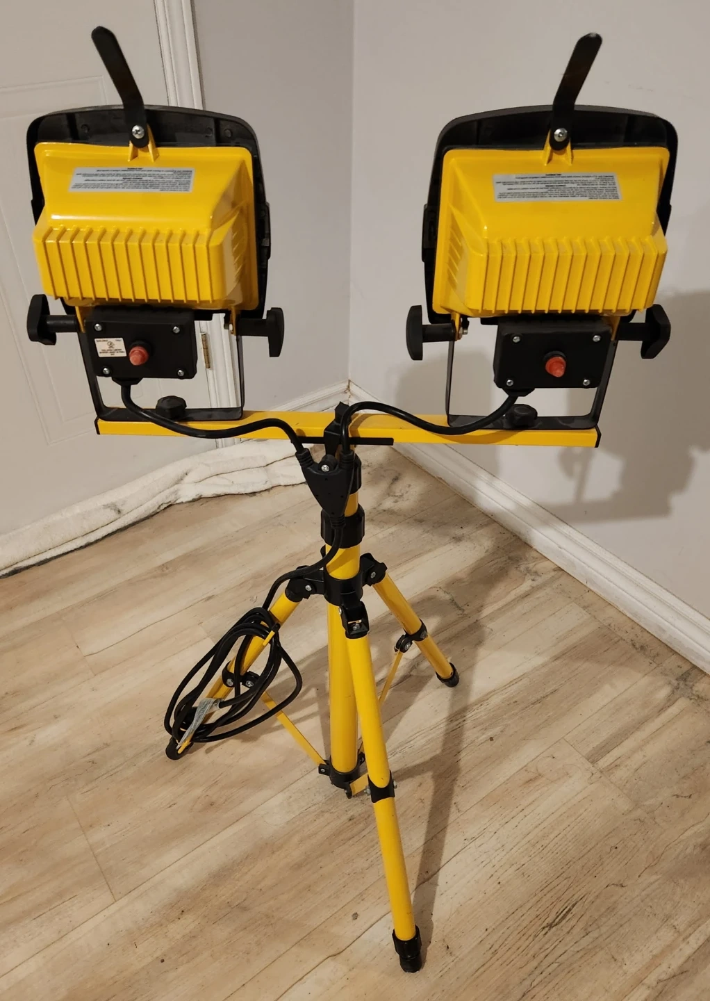 This twin head work light comes with a yellow tripod stand. It's perfect for illuminating job sites or workshops. The lights are adjustable and the stand is collapsible for easy storage.
