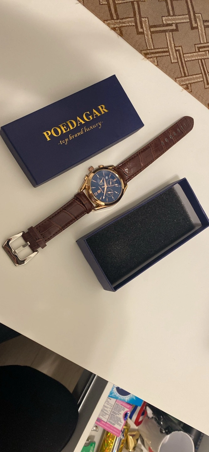 Selling a Poedagar luxury watch. It comes with its original box. The watch features a brown leather strap and a blue face. It's a stylish accessory for any occasion