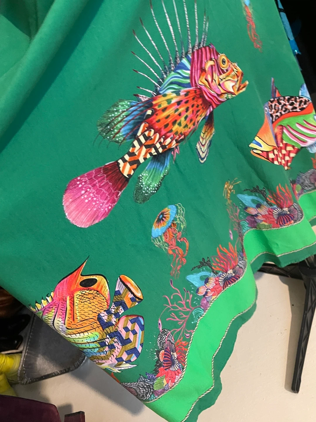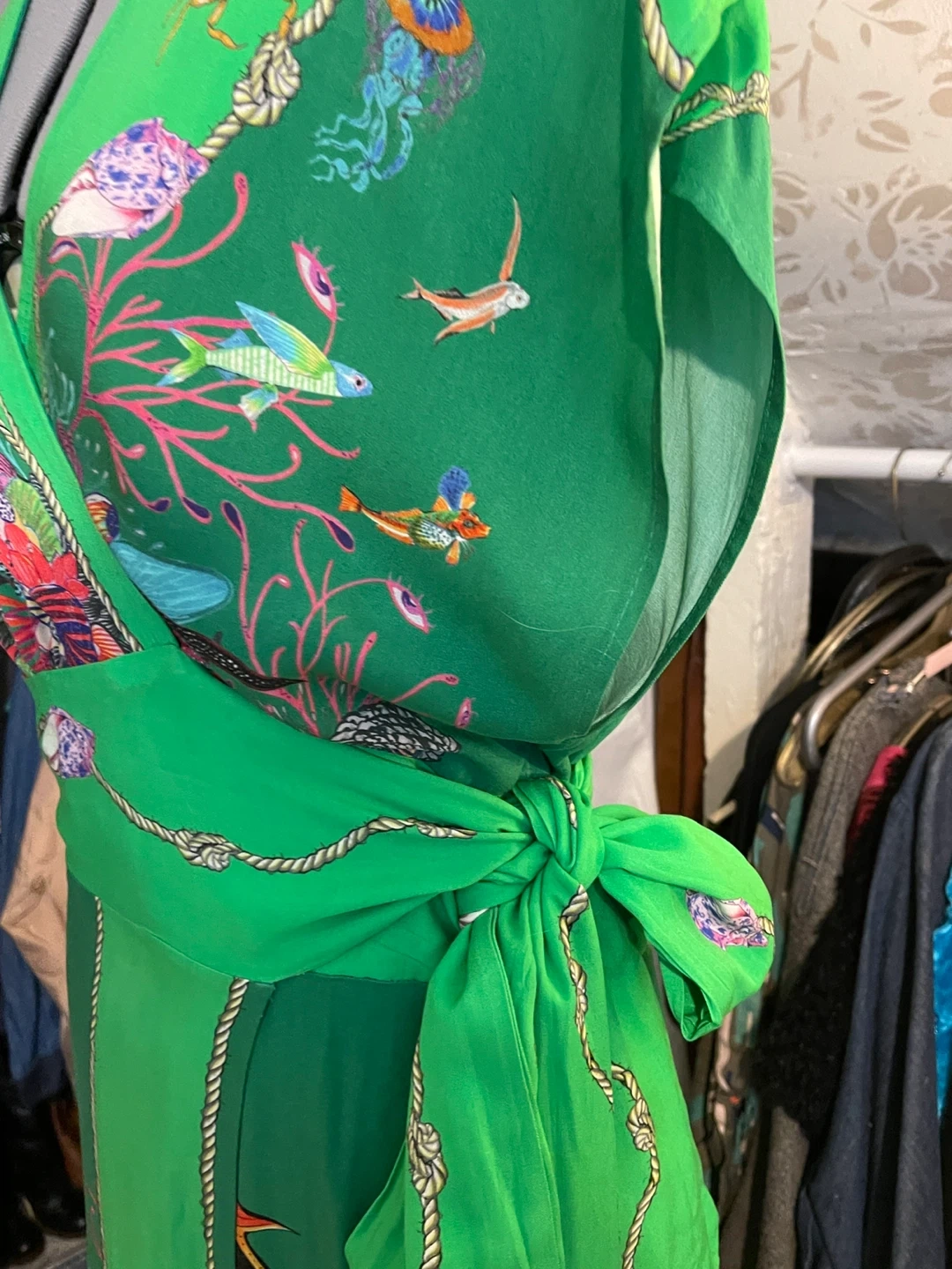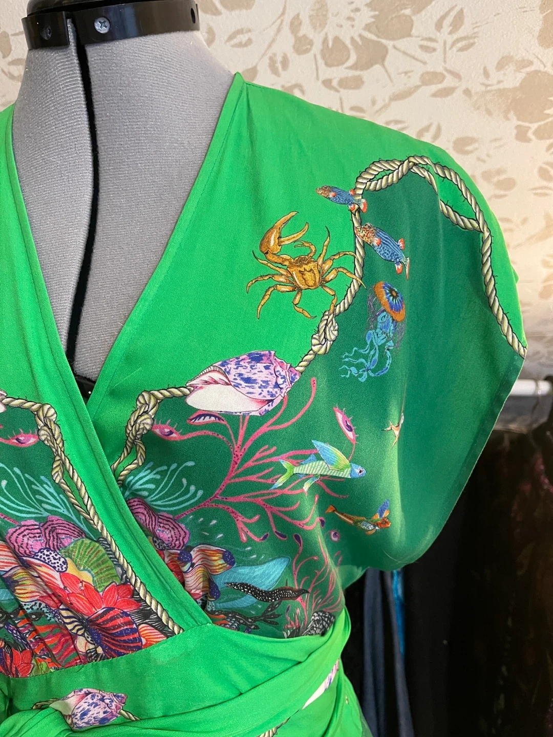 Stunning and rare Colcci Jeanswear wrap dress featuring an ultra-vibrant underwater print with fish, coral, seashells, and marine motifs. A true statement piece from Brazil — bold, artistic, and beautifully constructed.