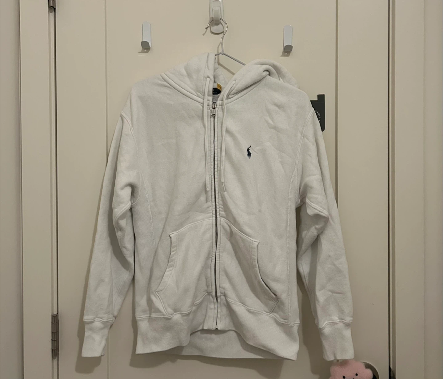 This is a white zip-up hoodie by Polo Ralph Lauren. It features the signature polo player logo embroidered on the chest. Made from a comfortable cotton blend.