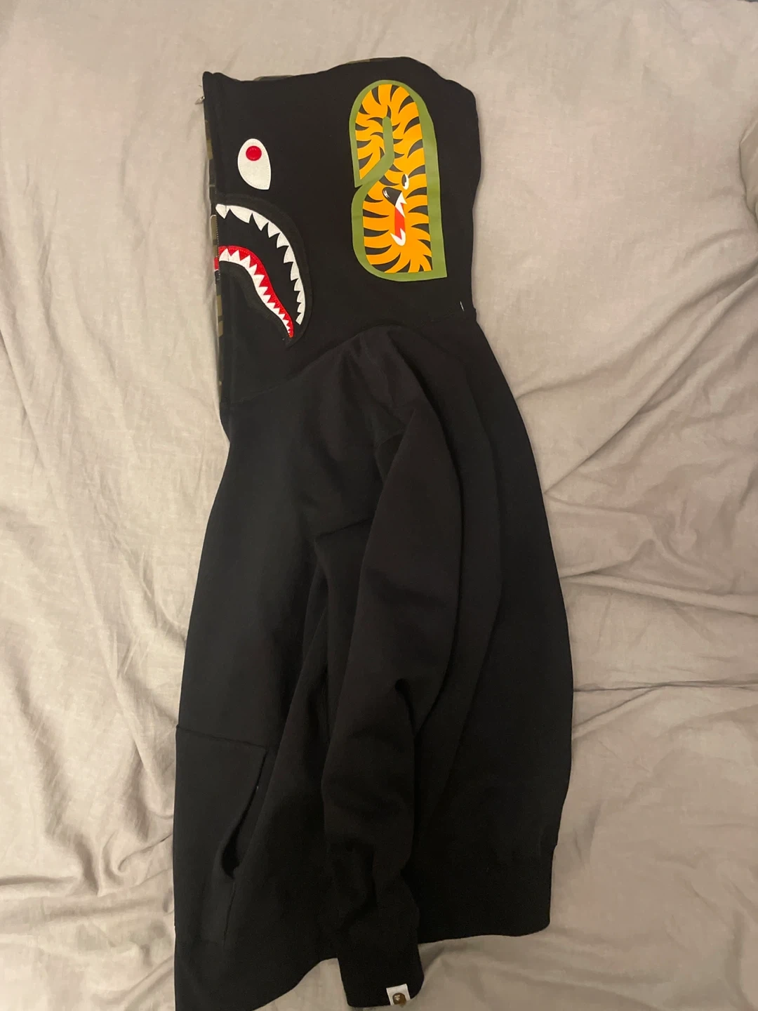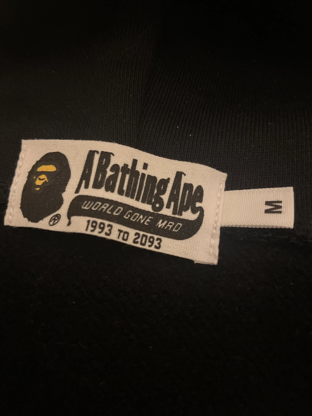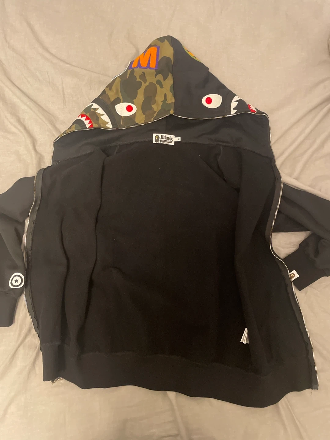 This is an A TRIED ON Bathing Ape full zip hoodie. It features the iconic shark design on the hood and has a size M tag.